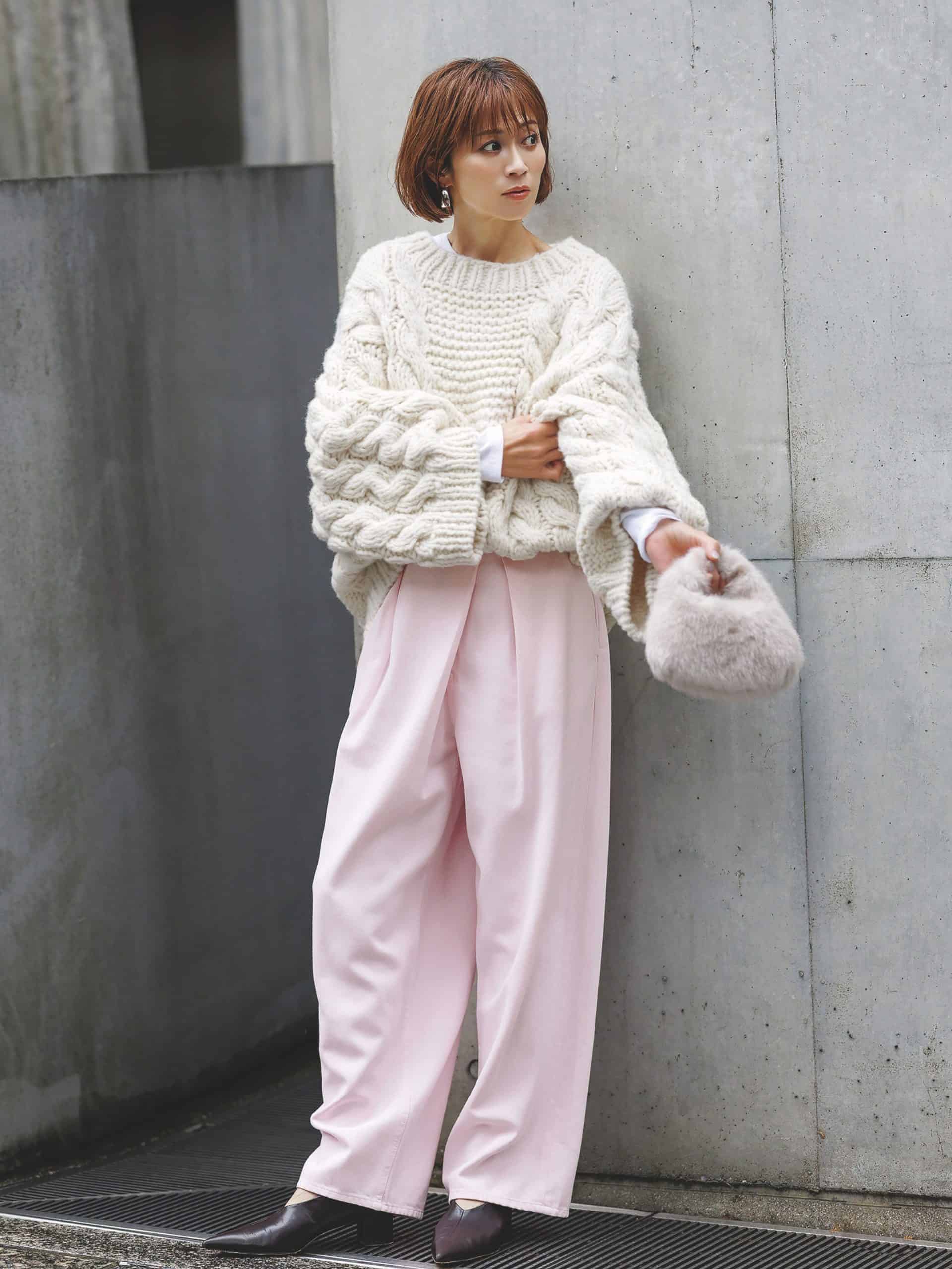 暗色に走りがちなこのシーズンは、あえて薄ピンクをチョイス。淡色特有の儚さが冬の景色に不思議とマッチするんです。桜のようなビジュアルは、春先にも思わず挑戦してみたくなります。
