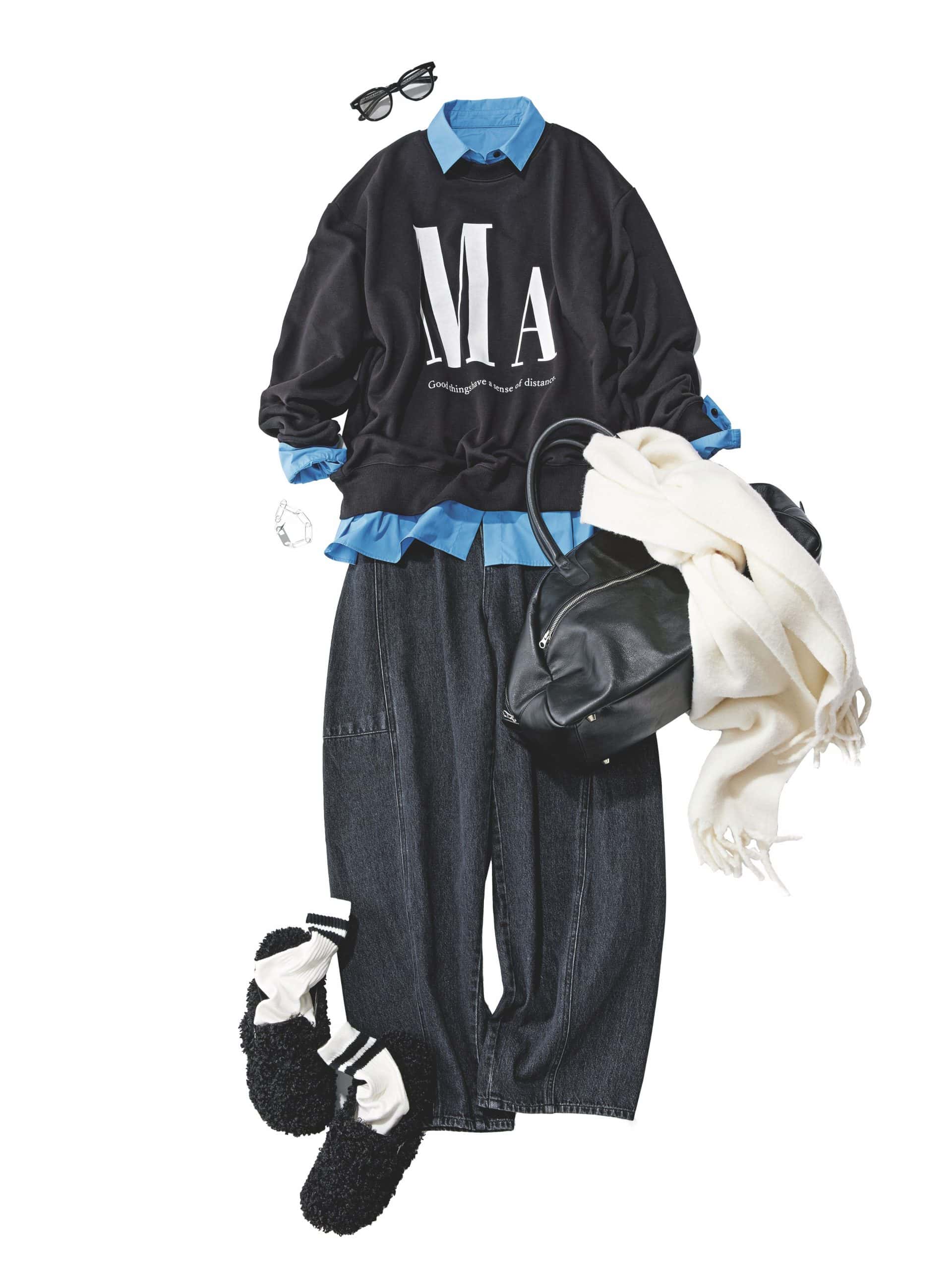 デニムパンツ¥31,900(RHC/RHC ロンハーマン)スウェットプルオーバー¥6,930シャツ¥12,100バッグ¥24,200(すべてファーストハンド/ファーストハンド)ストール¥2,990(ユニクロ)サンダル¥30,800(ツル バイ マリコ オイカワ)ソックス¥1,375(靴下屋/タビオ)サングラス¥50,600(アイヴァン/アイヴァン 東京ギャラリー)ブレスレット¥24,200(ワンエーアールバイウノアエレ/ウノアエレ ジャパン)