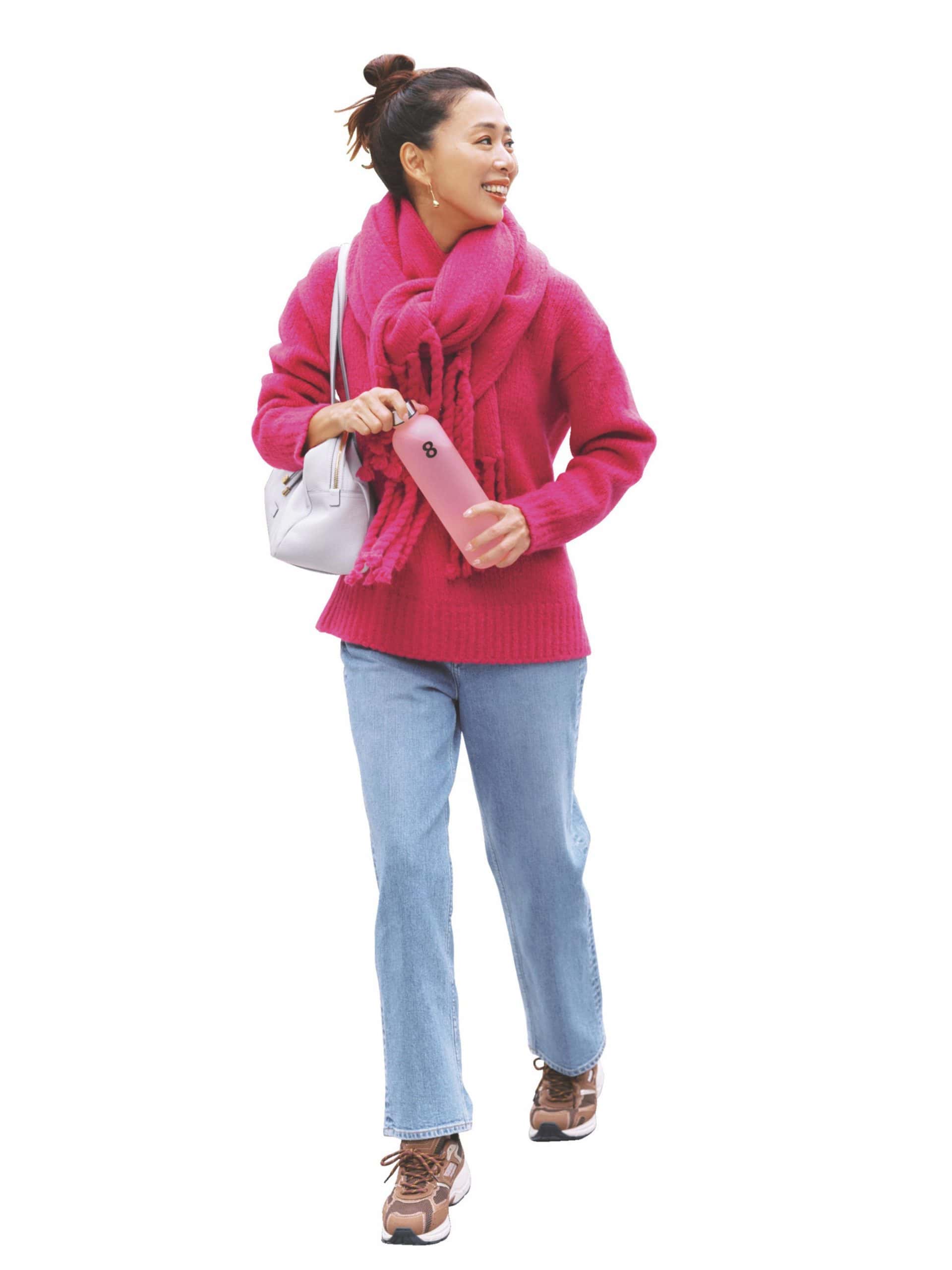 デニムパンツ¥25,300(RED CARD for TOMMORROWLAND/TOMORROWLAND)ニット¥28,930マフラー¥19,910(ともに23区/オンワード樫山)バッグ¥69,300(ジャンニ キアリーニ/ジャンニ キアリーニ 銀座店)スニーカー¥31,900(モエア/アマン)ピアス¥36,300(プラウ)ボトルは私物。