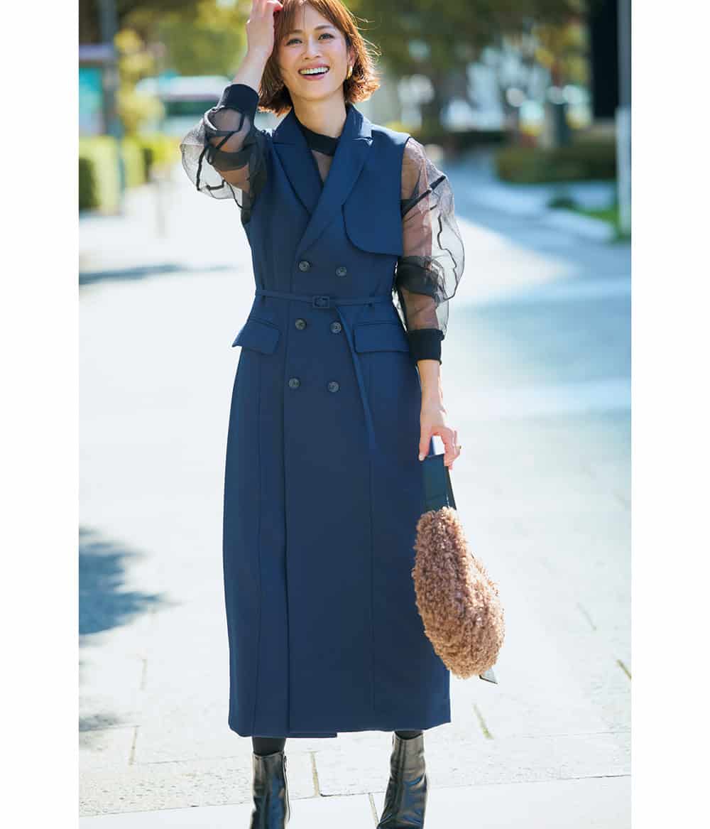 ジレワンピース¥39,600(ウィークエンド)プルオーバー¥19,800(エステ/サードマガジン)バッグ¥25,300(ヴィオラドーロ/アルアバイル)ブーツ¥31,900(ダイアナ/ダイアナ 銀座本店)ピアス¥44,000リング¥60,500(ともにヴィール/エストネーション)
