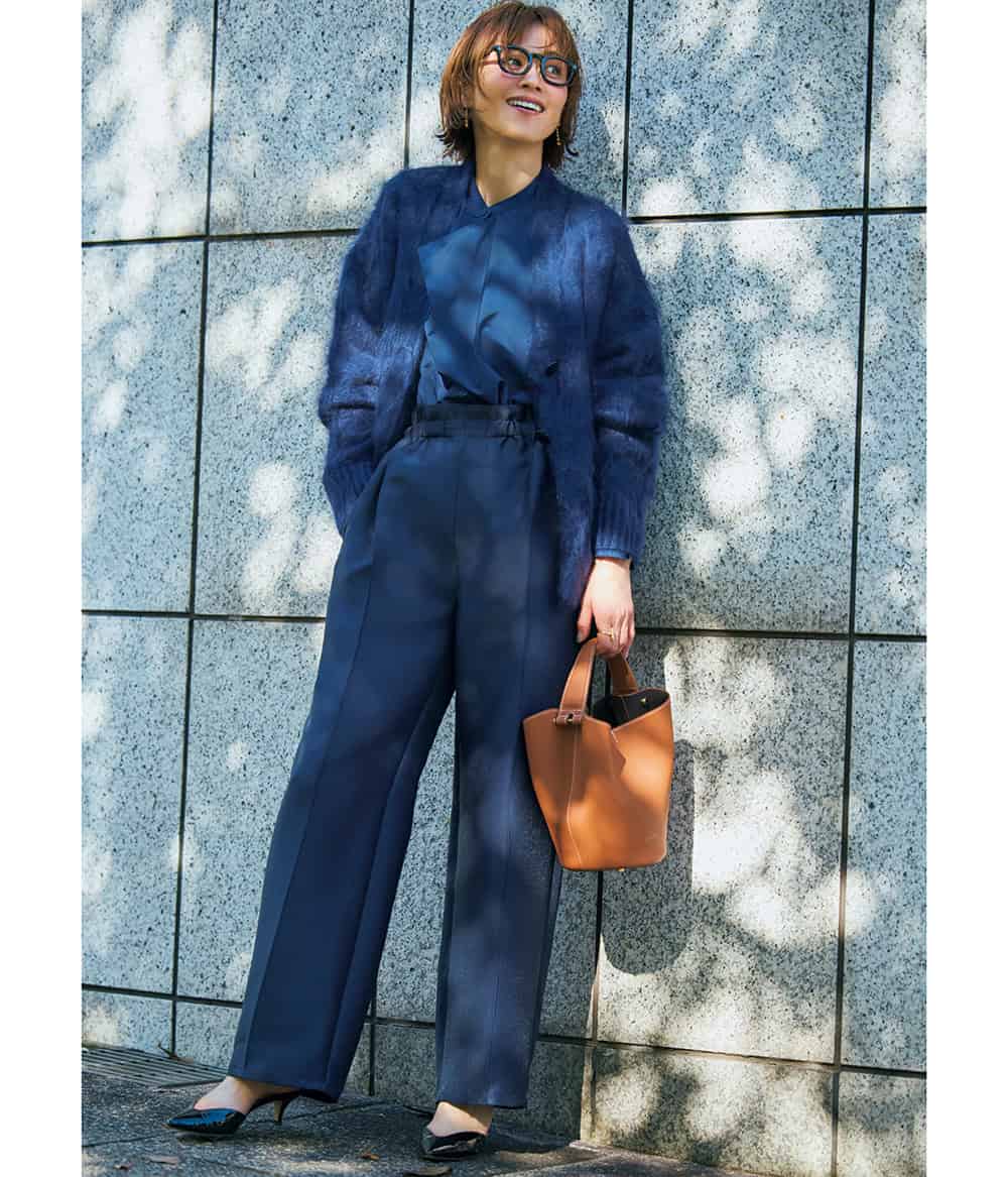 パンツ¥36,300(ドローイング ナンバーズ/ドローイング ナンバーズ 新宿店)カーディガン¥88,000ブラウス¥27,500(ともにhLM/ヒューエルミュージアム オモテサンドウヒルズ)バッグ¥41,800(フィールアンドテイスト/ANAYI)パンプス¥64,900(ネブローニ)メガネ¥46,200(アイヴァン/アイヴァン 東京ギャラリー)ピアス¥40,700(リエスタジオ/アルアバイル)リング¥51,810〈参考価格〉(オーガスト)