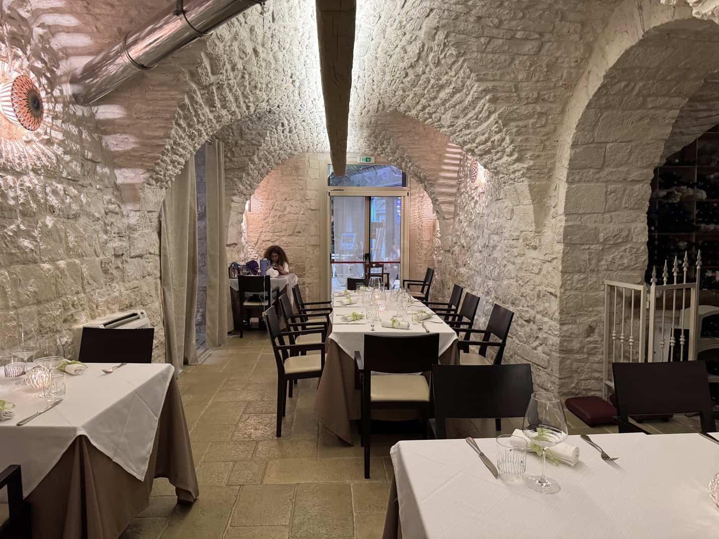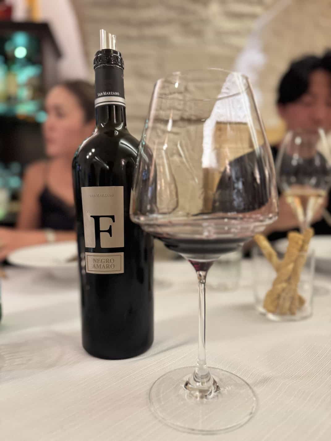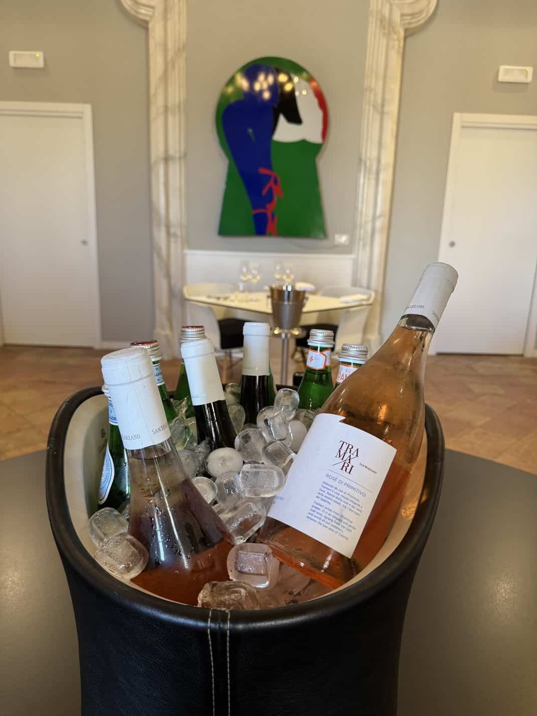 店内のワインセラーには、500種類以上ものラベルが並ぶとされ、プーリアの地元ワインはもちろん、国際的にも評価の高い銘柄まで多彩なラインナップが揃っており、料理とのペアリング提案も人気。