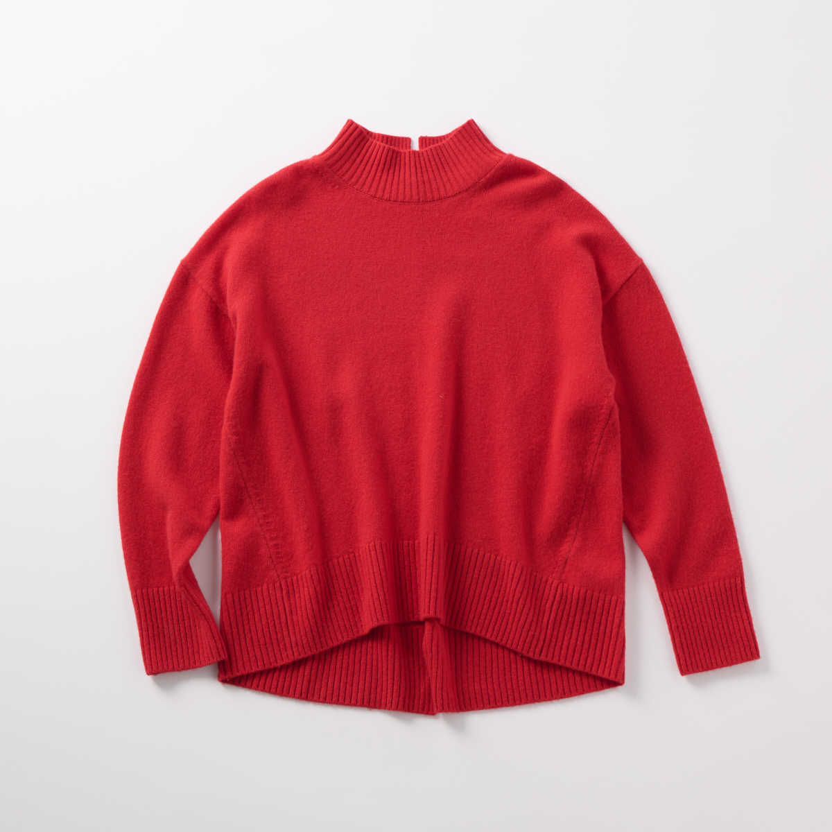 ほどよいゆったりしたサイズ感で、後ろはお尻が隠れる長さのハイネックプルオーバー。後ろにスリットが入っているのでバックスタイルも素敵に見せてくれるデザイン。しかも自宅で手洗いできるのでお手入れも楽ちん!ニット¥10,990(アンフィーロ)