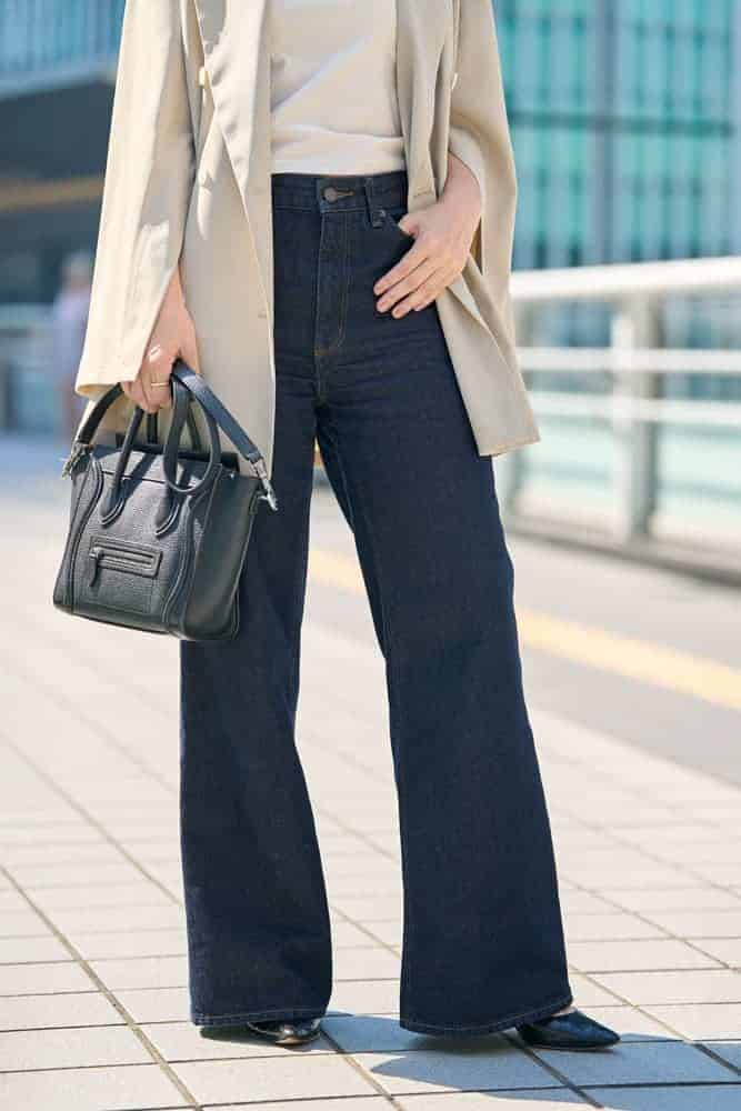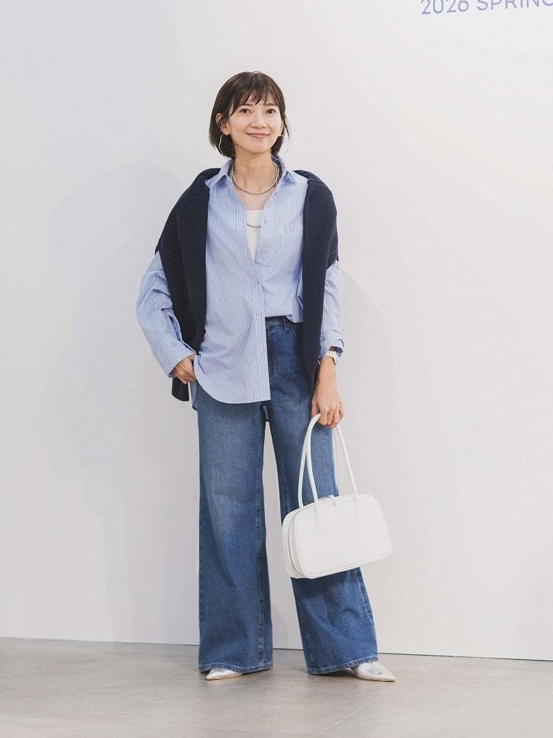 ユニクロのライトブルーデニムは、カジュアル感がありながらも大人が穿きやすい一本。ハイウエスト×ゆったりシルエットで、自然と全身バランスが整いスタイルアップを後押しします。明るいブルーがコーデに軽さをもたらし、ジャケット合わせで品よく昇華できる名品です。