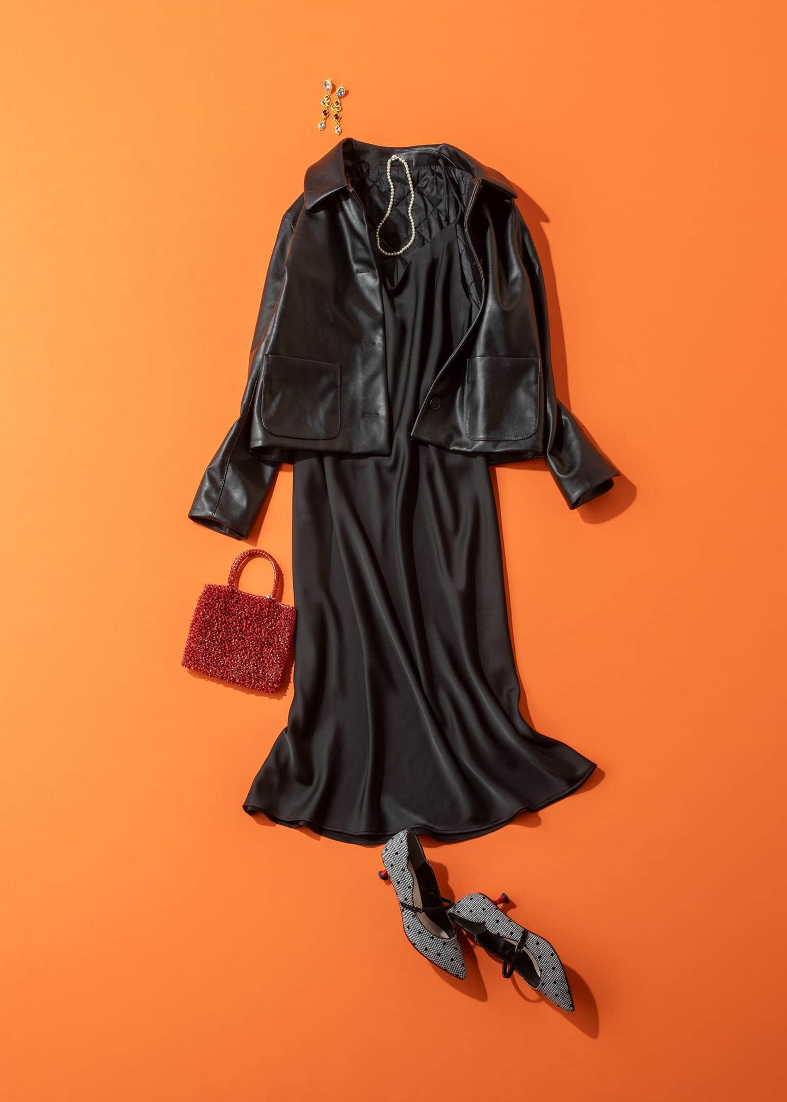 ジャケット¥7,990 ワンピース¥3,990(ともにUNIQLO) バッグ¥36,300(アンテプリマ/ワイヤーバッグ/アンテプリマ カスタマーサポート) 靴¥18,150(ダイアナ/ダイアナ 銀座本店) ピアス¥12,100 ネックレス¥6,930(ともにアビステ)