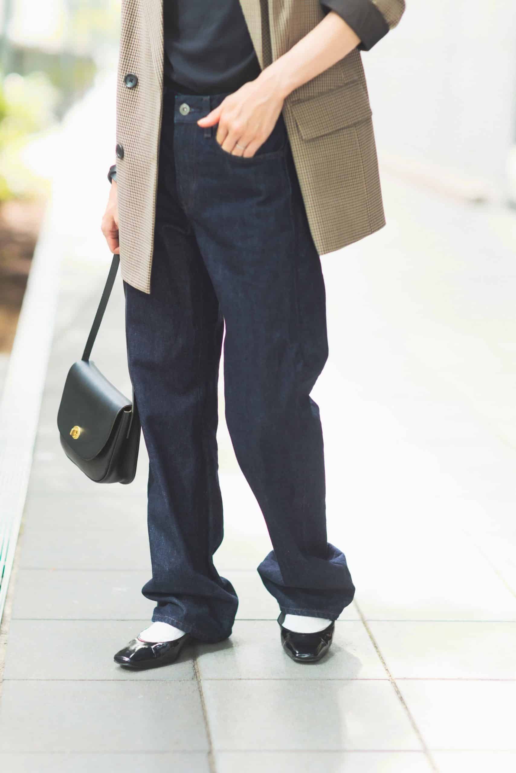 ユニクロとJW ANDERSONのコラボデニムは、計算された太さが魅力。腰まわりはすっきり、裾に向かって自然に落ちるストレートラインが大人にちょうどいいデニムです。シンプルなトップスを合わせるだけで、簡単にこなれ感が生まれます。