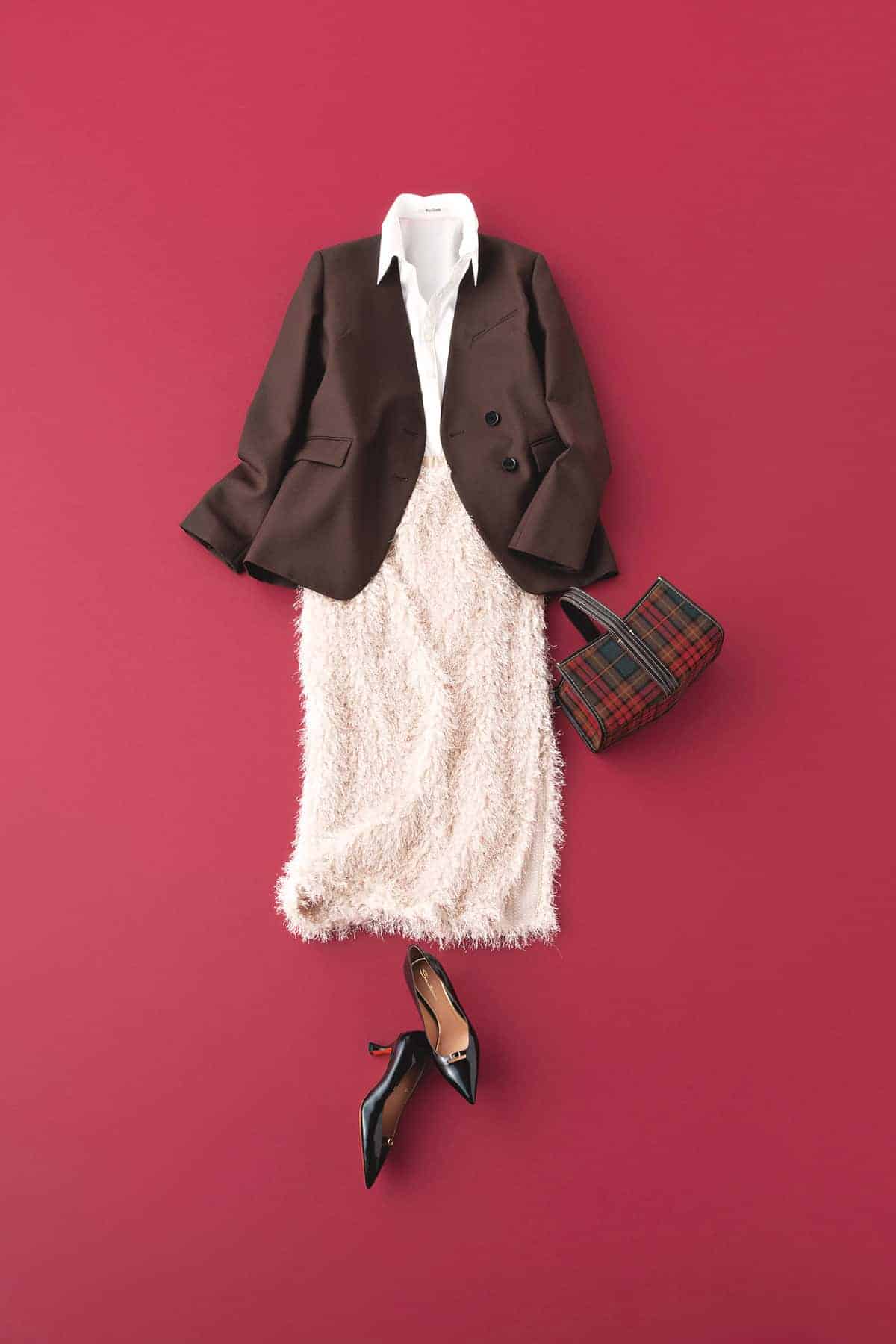 ヘアリーな質感の毛足の長いスカートも清潔感のある白シャツ×落ち着いたカラーのジャケットを合わせてきちんと感を意識。季節感のあるチェック柄ハンドバックで個性をプラス。