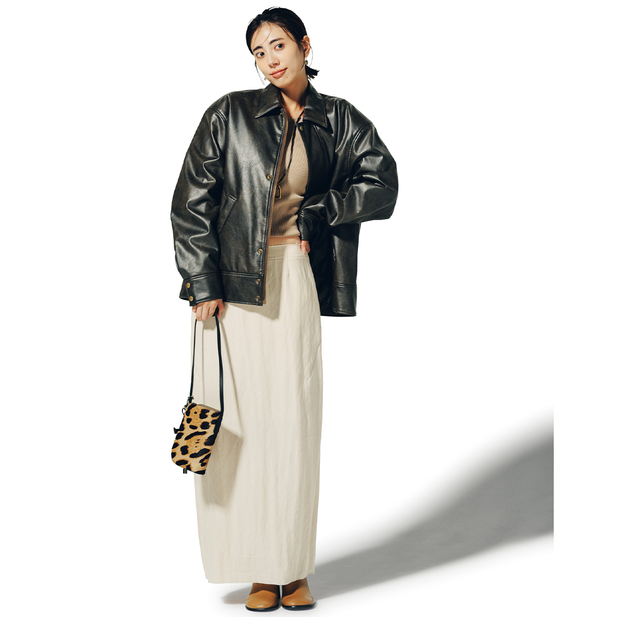 存在感のあるフェイクレザーブルゾンがハードに偏らないよう、トップスとボトムスを淡いトーンで繋げるのがポイント。明るい配色が黒アウターの重さをほどよく和らげ、全体をクリーンに見せてくれます。レオパード柄のバッグを効かせれば、シンプルな色合わせに小気味いいアクセントが加わり、メリハリのある仕上がりに。