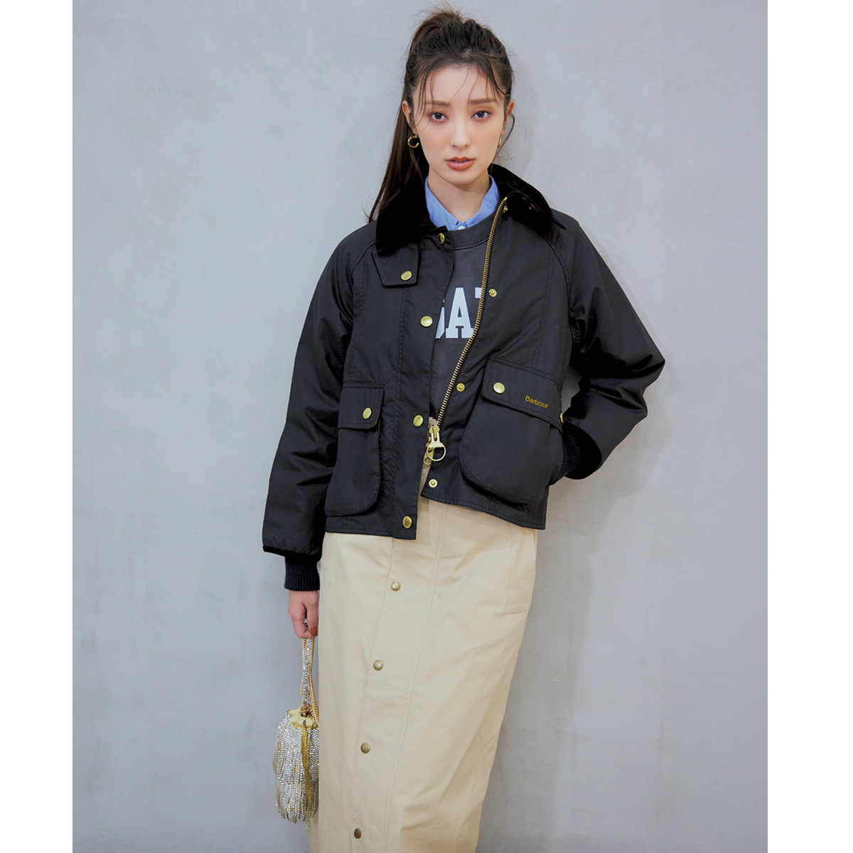 通勤でおなじみの黒アウターをアウトドア仕様にして、フレッシュに更新するのも手。ジャケットをインに重ねたレイヤードがきちんと見えをキープしつつ、赤ニットの差し色がさりげなく存在感を放ちます。ロングスカートとブーツを黒で統一すれば、実用性と洗練を兼ね備えつつ“ひとひねり効いた”スタイルに。