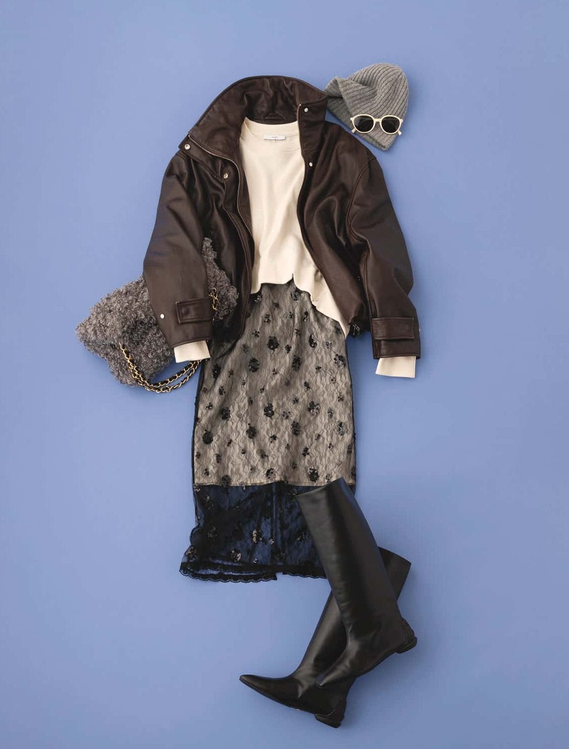 スカート¥24,200レザージャケット¥52,800(ともにプランクプロジェクト 青山店)スウェットトップス¥29,920(アストラット/アストラット新宿店)バッグ¥24,200(ヴィオラドーロ/アルアバイル)ブーツ¥69,300〈シーセイ〉ニット帽¥19,800〈アソース メレ〉(ともにアイネックス)サングラス¥23,800(カリン)