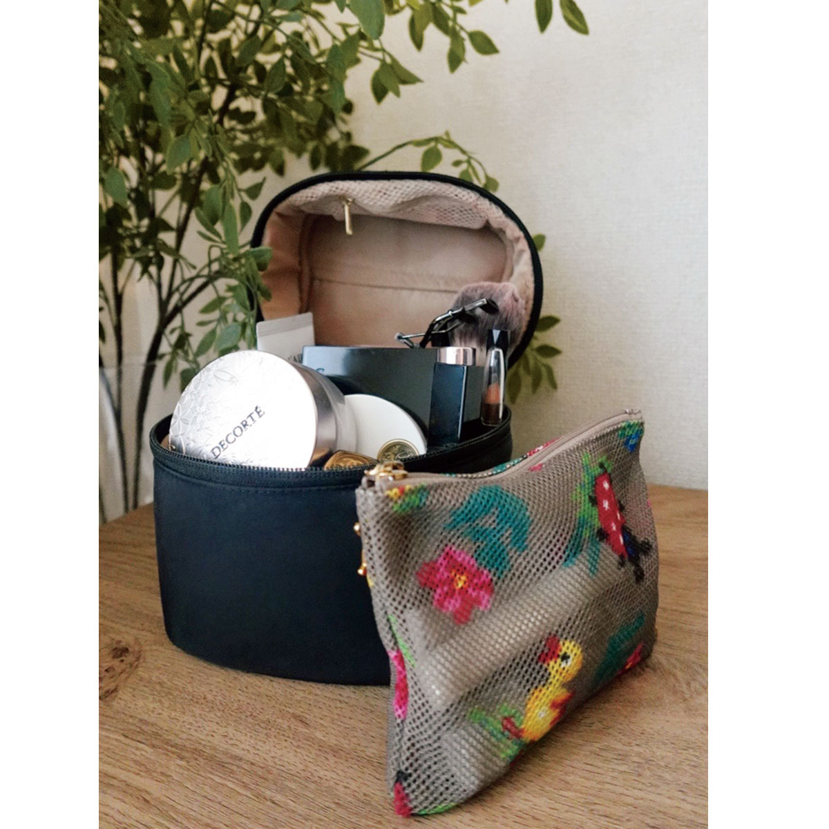 「楽天市場で購入したバニティポーチにはいつも使うメークアイテムをギュッと収納。出張の際もこのまま持っていけるので準備の手間もかかりません。持ち歩きポーチはフェイラーのもの。メッシュ素材で軽くてコンパクトなので、最低限必要なリップやコンシーラーなどを入れています」(植田 舞さん/29歳・商社)