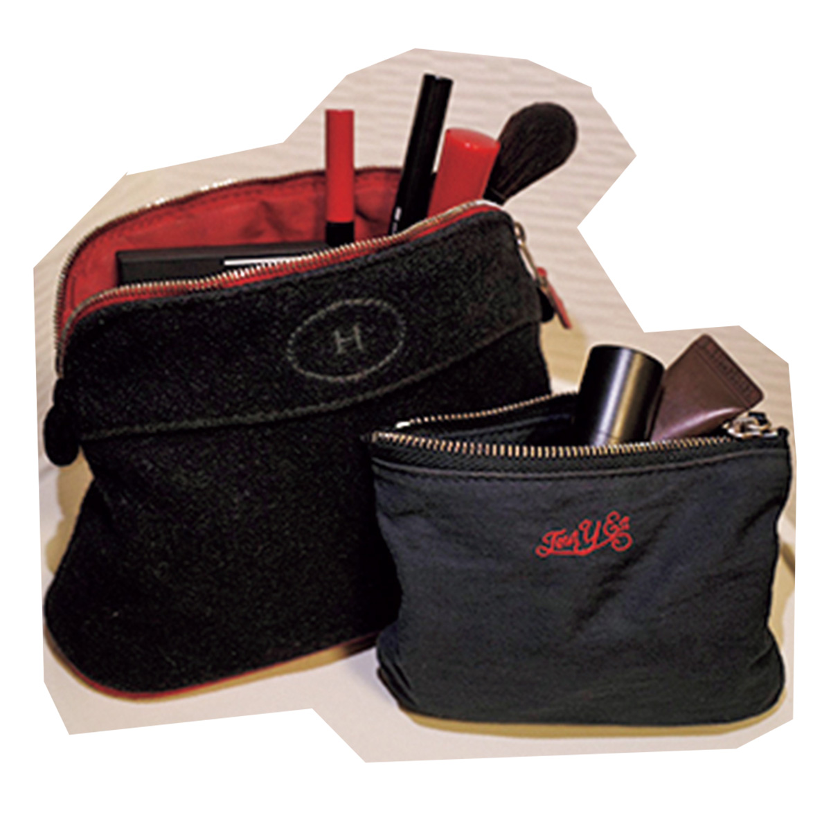 「平日メーク用のコスメは大容量ポーチに収納。休日などに使いたい2軍アイテムも別のポーチに。そしてまだ使えそうだけどしばらく使わないような3軍はジップロックに小分けしています。それらとは別に出先には、エルメスの中サイズポーチか、ミニバッグ用のTOUT Y ESTのポーチを使い分け」(井山かおりさん/29歳・商社)