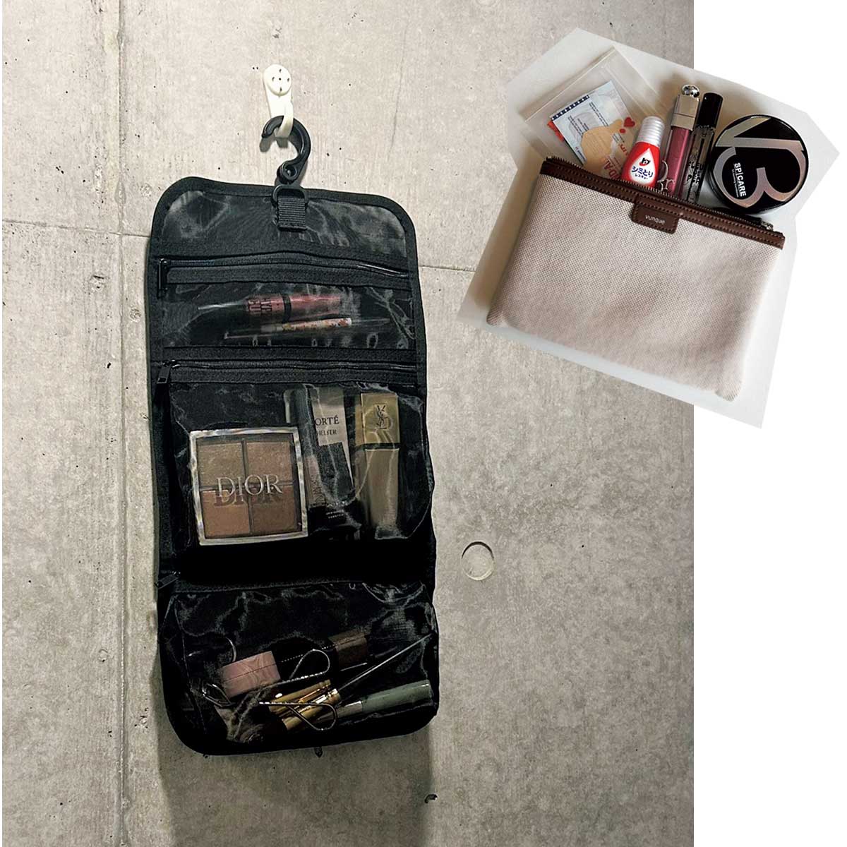 「自宅のコスメ収納はクリアケースとポーチの二刀流です。特に自立もしてくれるフック付きポーチは旅コスメをまとめるのにも最適。カテゴリーごとに細かく仕分けしていると、用途別にすぐに持ち出せて便利です。日々の持ち運び用は韓国ブランドvunqueのノベルティ。クッションファンデや服のシミ抜きなどのレスキューアイテムも入れています」(濱塚綾香さん)