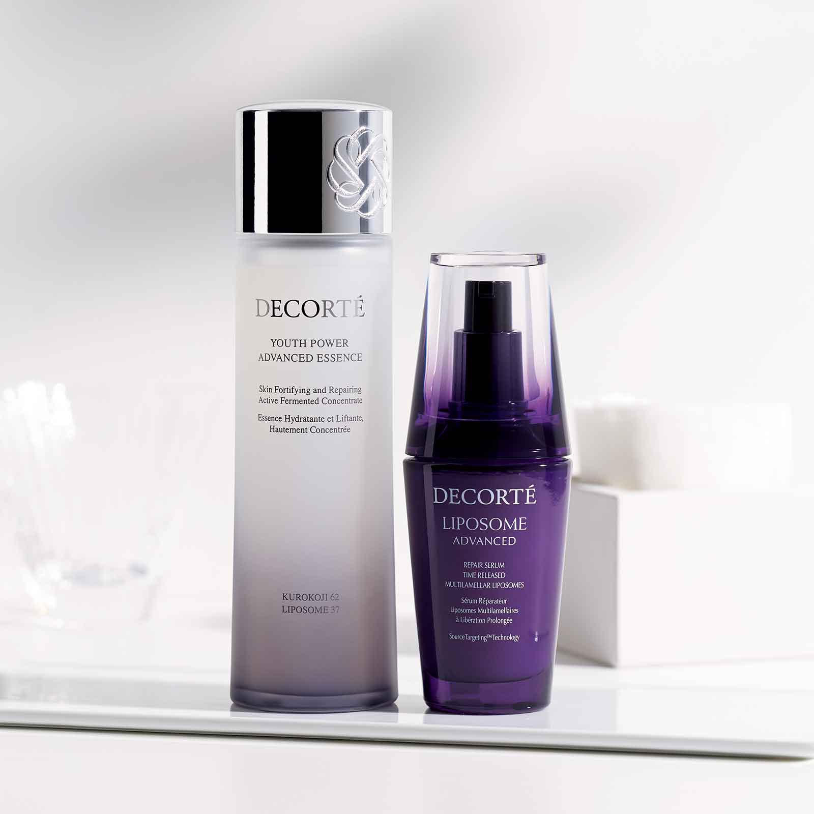 リポソーム技術の相性抜群。左:「黒麹発酵液」「多重層リポソーム美容水」配合。ユース パワー エッセンス ローション 150ml ¥16,500、右:1滴に1兆個の多重層バイオリポソーム配合。バリア機能を担うラメラ構造を修復。リポソーム アドバンスト リペアセラム 50ml ¥12,650(ともにコスメデコルテ