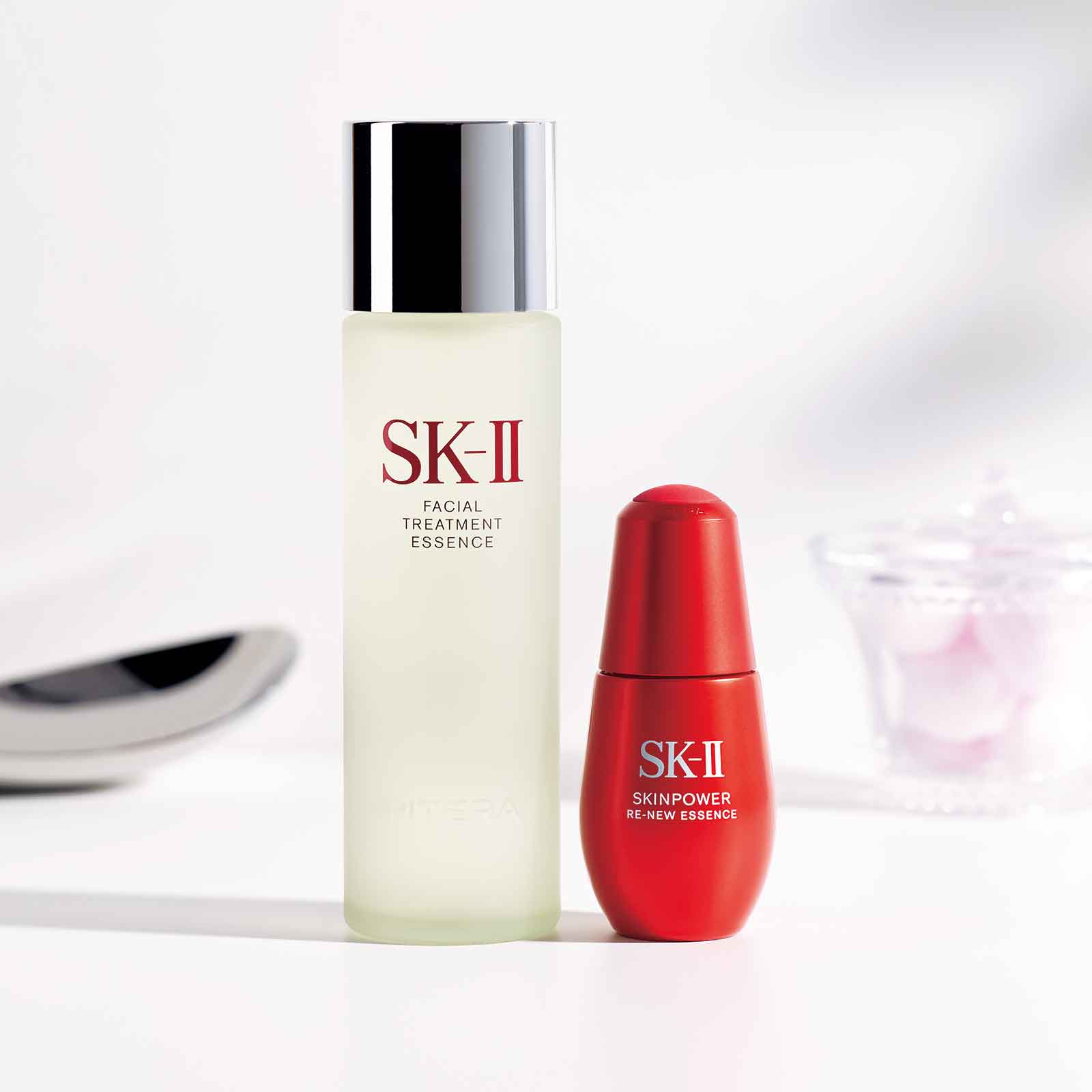 SK-IIだけの天然由来成分ピテラ™の浸透を高める。左:乾燥による小ジワやゴワつき、くすみなど肌悩みに根本アプローチ。フェイシャル トリートメント エッセンス 160ml ¥23,100、右:保湿カクテルがピテラ™を肌の中にとどめる。ハリケア成分配合。スキンパワー リニュー エッセンス 30ml ¥18,150〈ともに編集部調べ〉(ともにSK-II