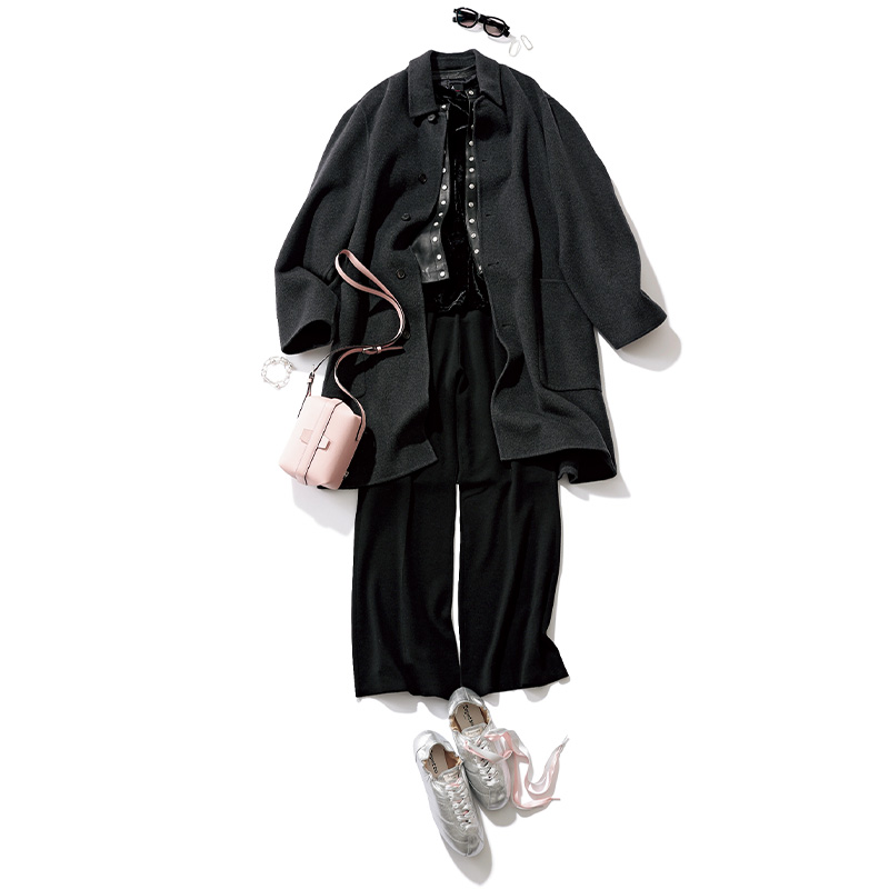 スニーカー¥67,100(レペット/ルック ブティック事業部)コート¥275,000(ATON/エイトン青山)レザーカーディガン¥330,000(アニエスベー)トップス¥23,980(オブラダ/シンチ)ニットパンツ¥37,400(アナイ)サングラス¥74,800(アイヴァン 7285/アイヴァン 7285 トウキョウ)ピアス¥25,300ブレスレット¥71,500(ともにブランイリス/ブランイリス トーキョー)バッグ¥341,000(ヴァレクストラ/ヴァレクストラ ジャパン)