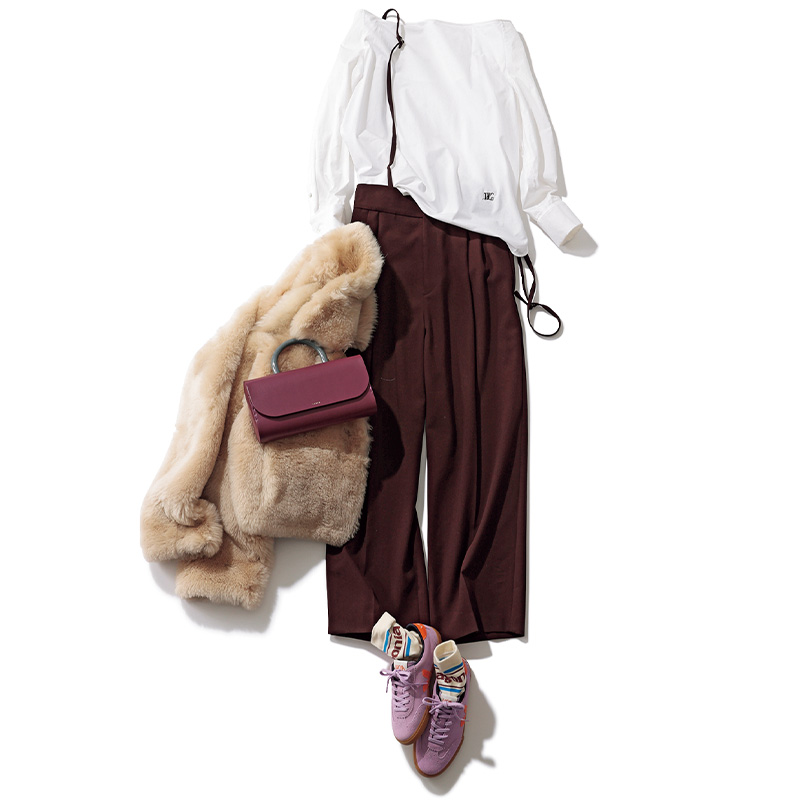 スニーカー¥27,500(Veja/シードコーポレーション)ファーブルゾン¥308,000〈ゲミニー〉オフショルダーブラウス¥25,300サスペンダーパンツ¥38,500〈ともにウィム ガゼット〉(すべてウィム ガゼット 玉川髙島屋S・C店)バッグ¥91,300(サルチェ/フラッパーズ)ソックス/スタイリスト私物