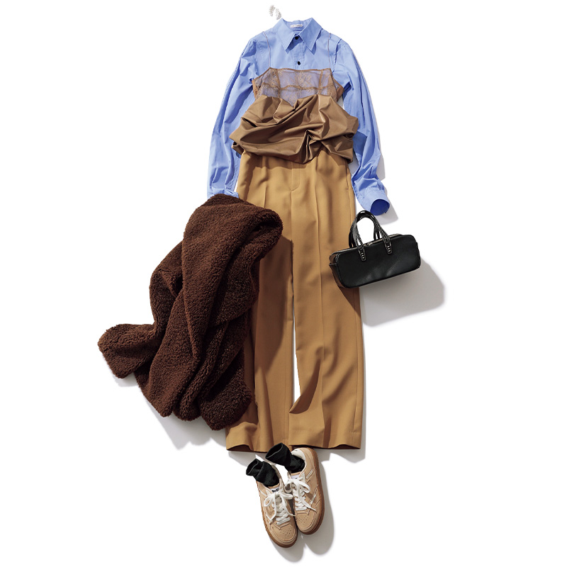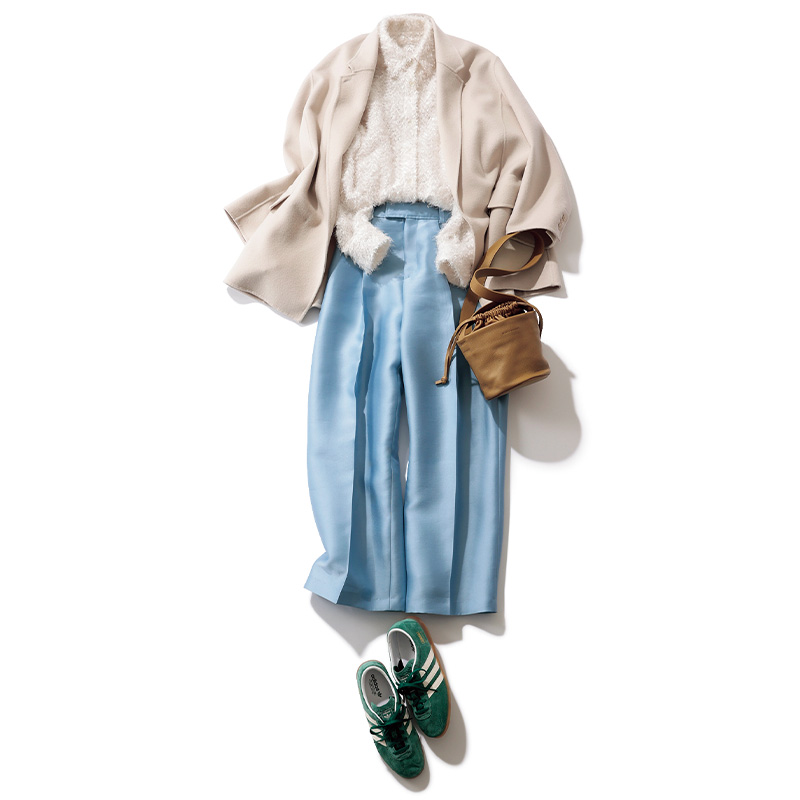 スニーカー¥15,400(アディダス オリジナルス/アディダスコールセンター)シャツ¥22,000(ザ ポーズ/ウィム ガゼット ルミネ新宿店)パンツ¥26,400(カデュネ/カデュネ プレスルーム)コート¥59,400(サロン アダム エ ロペ)バッグ¥66,000(ザハイライツ)