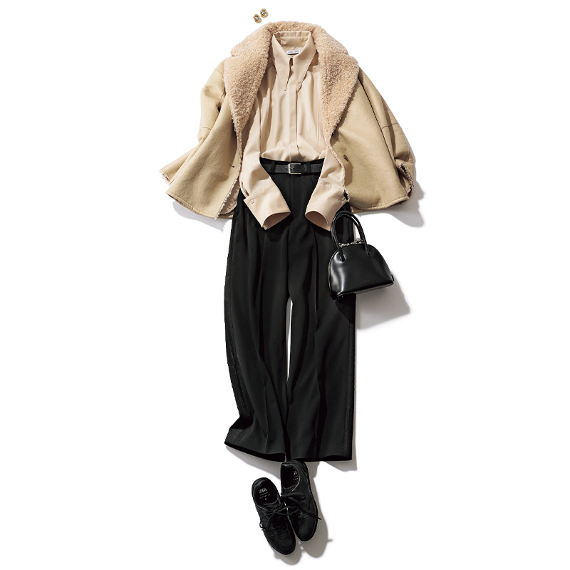 スニーカー¥16,500(アスファルト/アースマーケティング)コート¥130,900パンツ¥43,780(ともにザ・リラクス)ジャケット¥70,400(サードマガジン)ブラウス¥25,300(ウィム ガゼット/ウィム ガゼット 玉川髙島屋S・C店)サングラス¥47,300(アイヴァン/アイヴァン 東京ギャラリー)バッグ¥38,500(TOV/ユナイテッドアローズ 六本木ヒルズ店)