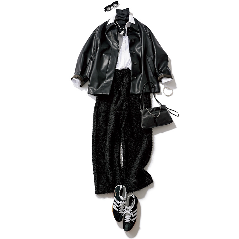 スニーカー¥14,300(アディダス オリジナルス/アディダス コールセンター)ジャケット¥12,980(CITEN/ユナイテッドアローズ カスタマーサービスデスク)シャツ¥31,900(アナイ)ニット¥24,200(ウィム ガゼット/ウィム ガゼット 玉川髙島屋S・C店)パンツ¥26,400(ザ ポーズ/ウィム ガゼット ルミネ新宿店)バッグ¥28,600(ラシット/ラシット 京王百貨店新宿店)メガネ¥70,400(アイヴァン 7285/アイヴァン 7285 トウキョウ)ネックレス[短]¥19,800(チビ・ジュエルズ/チビジュエルズ・ジャパン)ネックレス[長]¥28,600〈アドラル〉バングル¥85,800〈バルブス〉(ともにZUTTOHOLIC)