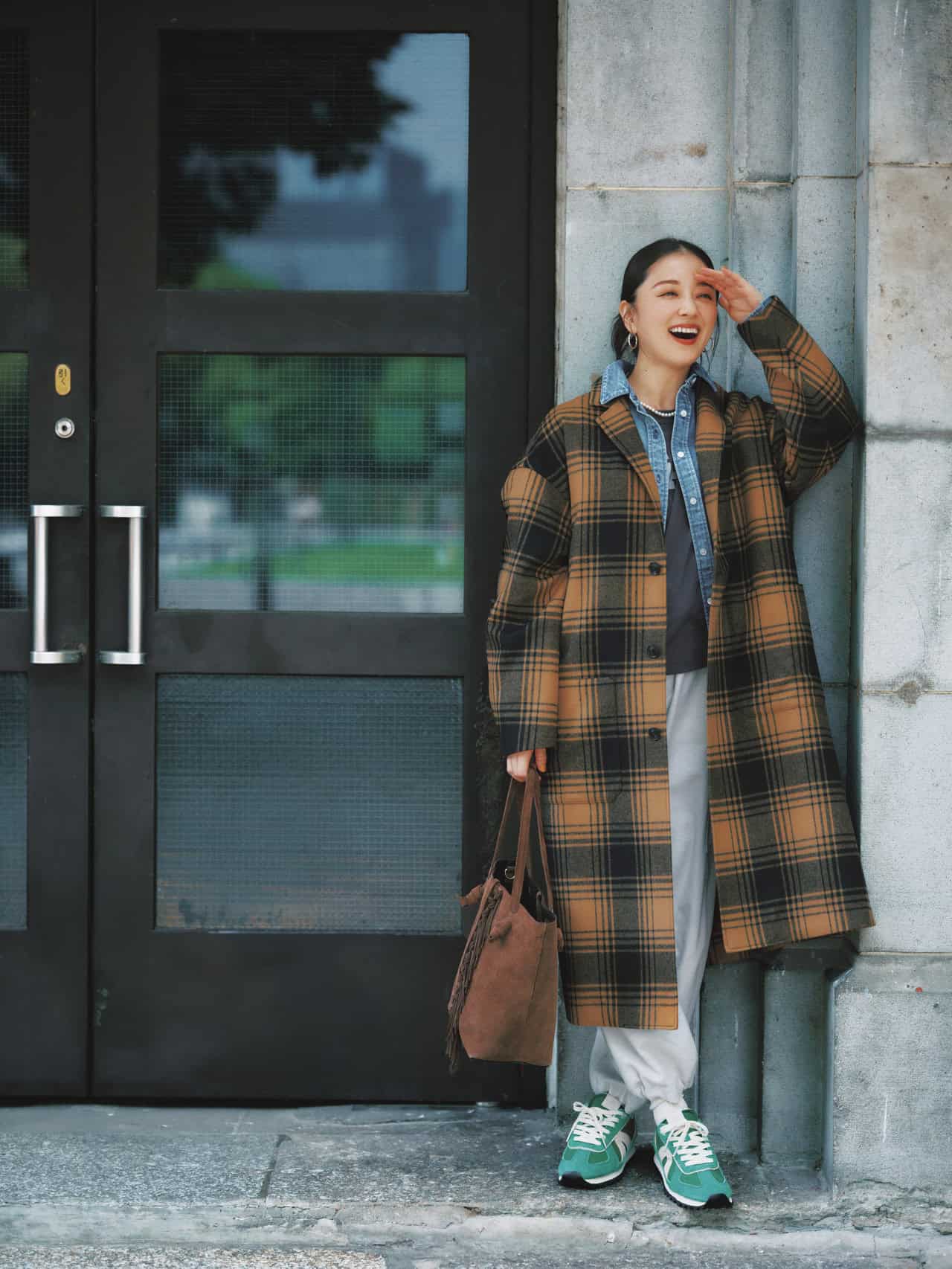 青みグリーンのスニーカーが、重くなりがちな冬コーデに鮮度をもたらすアクセントに。足元に明るさを置くだけで一気に軽やかな印象に仕上がります。品のあるカラーだからこそ、遊び心がありながら大人らしくまとまる新鮮スタイルです。