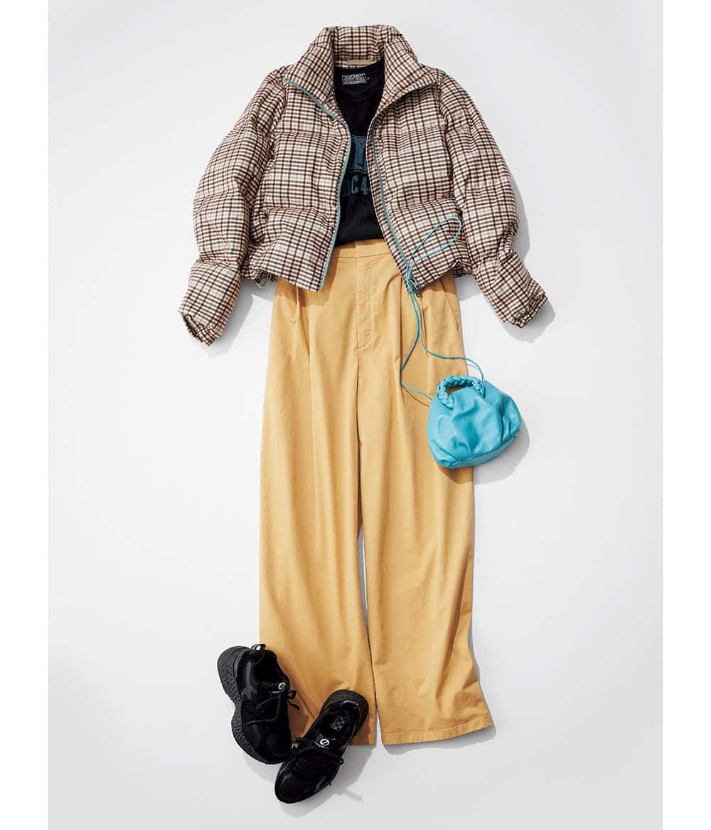 スニーカー¥29,700(ノーネーム/ストックマン)チェック柄ダウンジャケット¥104,500(ウールリッチ/ウールリッチ 二子玉川店)サーマルカットソー¥22,000(ヒステリックグラマー)パンツ¥39,600(ベイジ,/オンワード樫山 お客様相談室)バッグ[別注カラー]¥71,500HEREU/ebure/リトルリーグ インク)