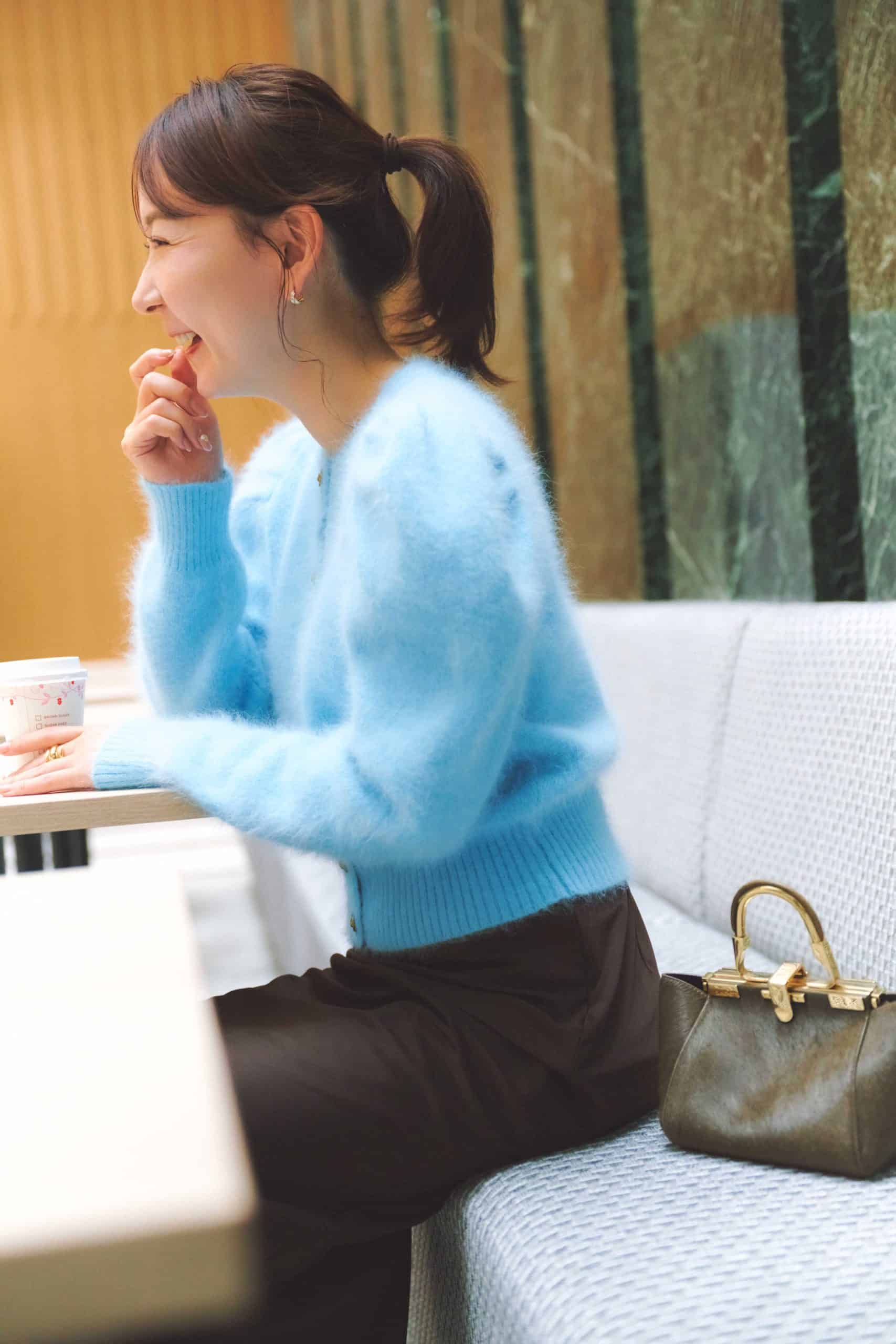 全体の色味はとても好みですが、個人的には、ふわふわしすぎる素材が少し苦手。モヘア系ならデザインはシンプルだと、甘くなりすぎず、より好印象に感じたと思います。近寄りがたさがないのに、品はきちんとあるのは、なんだか不思議です。
