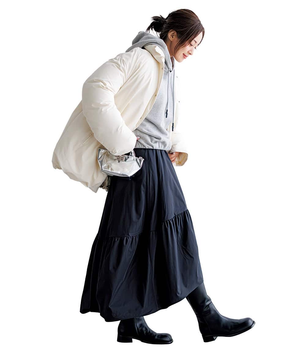 スカート(ブリル/ブリル新宿)ダウンコート¥99,000(ロエフ/エイチ ビューティー&ユース)パーカ¥33,990(アストラット/アストラット 新宿店)バッグ¥9,900(HELOYSE/ジャック・オブ・オール・トレーズ)ブーツ¥221,100(セルジオ ロッシ/セルジオ ロッシ ジャパン カスタマーサービス)
