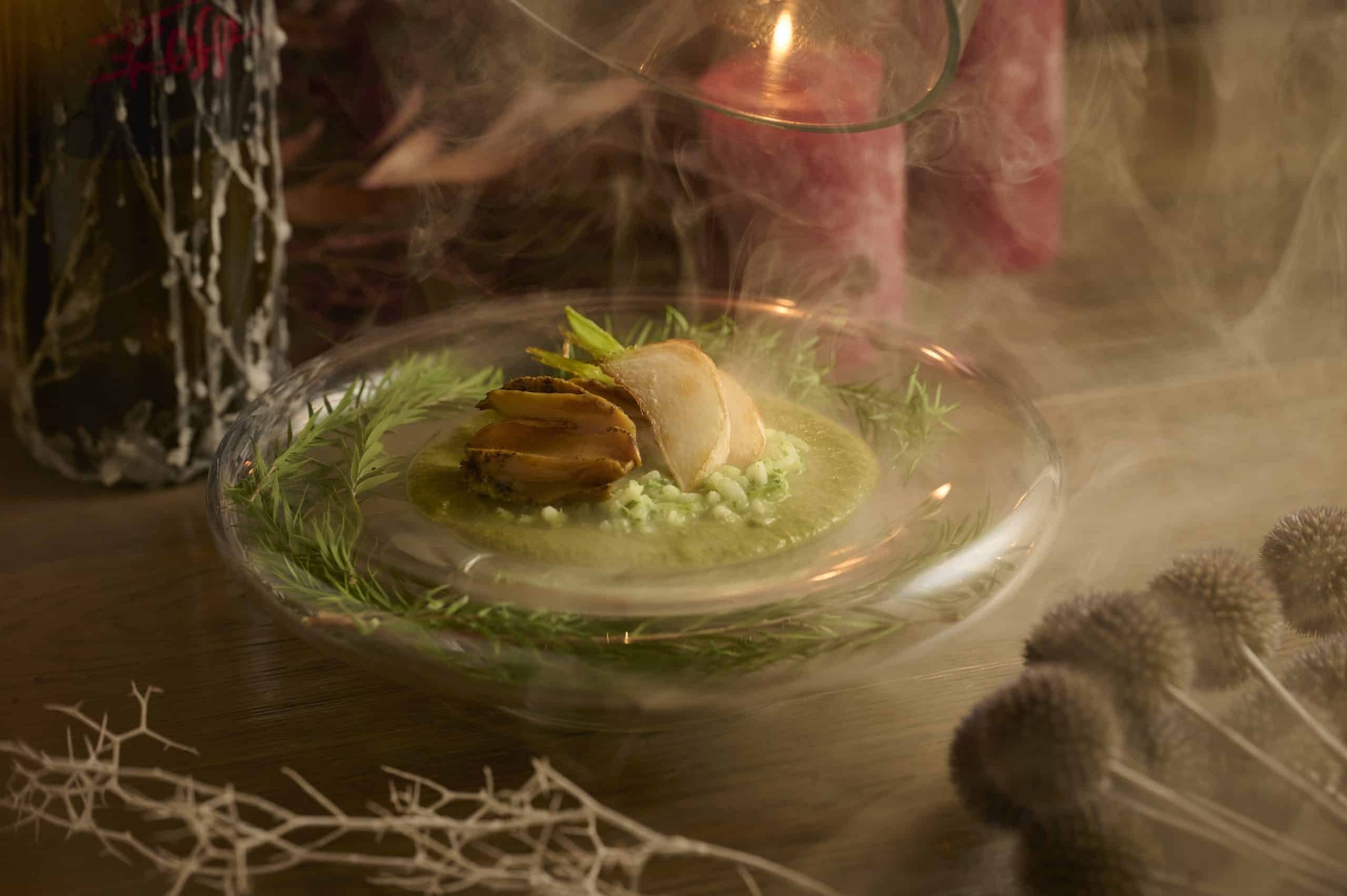 薪焼きした鮑と蕪をメインに、⼟台のリゾットには蕪の茎と鮑のキモを⽤いたソースを使⽤。⾷材を余すことなく丸ごと使い切ったサステナブルな⼀⽫、ラストのスモーキーな演出にもご注目!