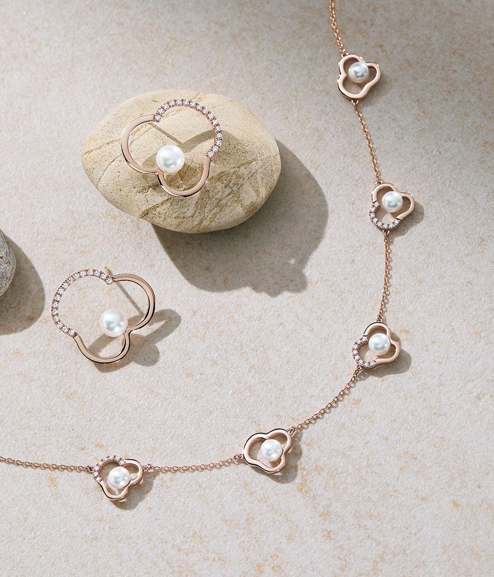 花のフォルムをグラフィカルに描いた、タサキを象徴するコレクション。甘さを抑えたモダンなデザインに高品質なパールの柔らかな光沢を添え、軽やかさと凛とした華やぎを同時に叶えます。