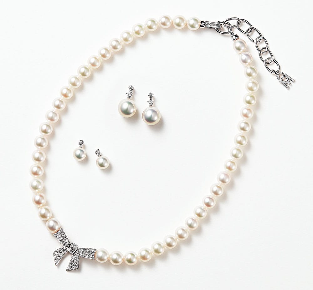 ネックレス「ボウ チャーム」〈アコヤパール×DIA×WG〉¥1,540,000ピアス[上]〈アコヤパール×DIA×WG〉¥663,300ピアス[下]〈アコヤパール×DIA×WG〉¥152,900(すべてMIKIMOTO/ミキモト カスタマーズ・サービスセンター)
