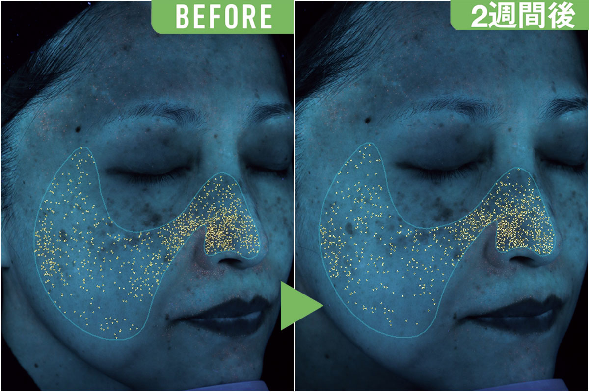 ツヤが出て透明感のある印象に変化。VISIAではシワ、ポルフィリンの値に改善が。ビタミンC誘導体、ビタミンB群が炎症と皮脂バランスを整えコラーゲン生成が進んだことで肌の内外が同時に整ったと見られます。