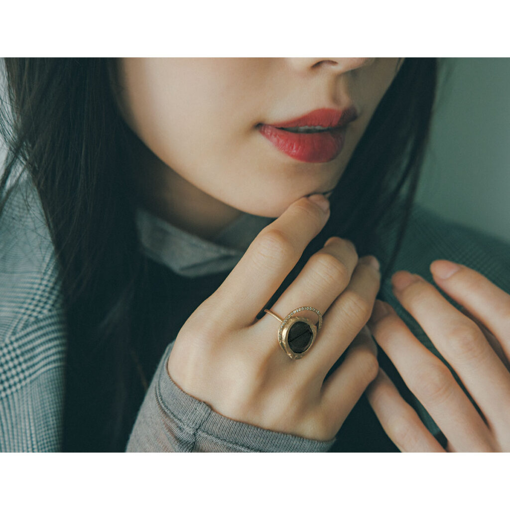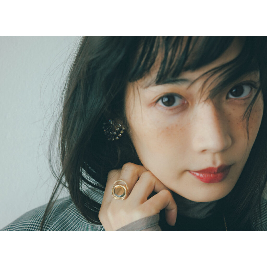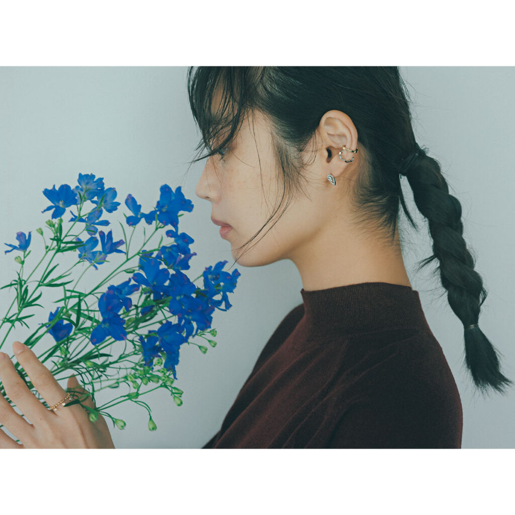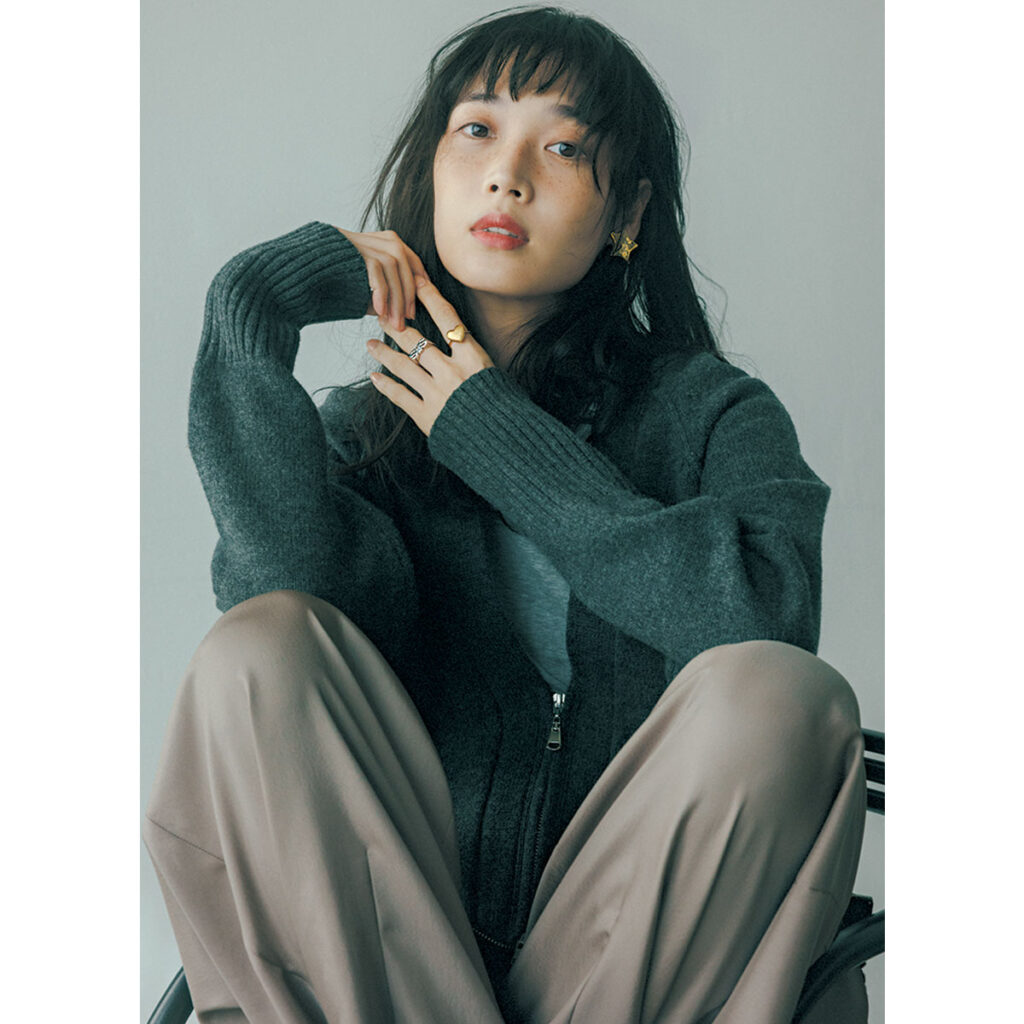イヤリング¥14,300(イリスフォーセブン/フーブス)左手人さし指リング〈SV×YGコーティング〉¥35,200(マリハ)左手中指リング〈SV×ホワイトジルコニア〉¥24,200(マリア ブラック/マリア ブラック 表参道店)中に着たTシャツ¥16,500(シー/エスストア)カーディガン¥42,900(ザ シンゾーン/シンゾーン ルミネ新宿店)パンツ¥39,600(ソブ/フィルム)