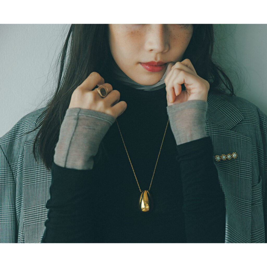 ピアス¥25,300ブローチ¥17,600(ともにアデルビジュー/アデルビジュー ショールーム)ネックレス〈SV×YGコーティング〉¥126,500(ソフィーブハイ/エスケーパーズ アナザーワールド)リング〈YG×D×ラブラドライト〉¥209,000(パスカルモンヴォワザン/ショールーム セッション)レイヤードタートルネックニット¥28,600(サードマガジン)ジャケット¥44,000(プランクプロジェクト/プランクプロジェクト 青山店)