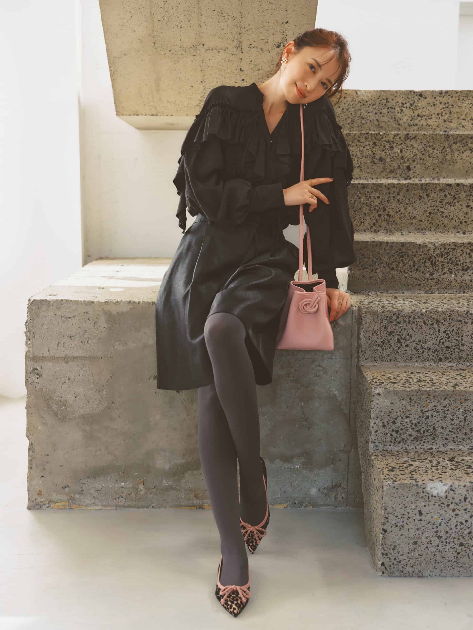 着慣れたほぼクロコーデは足元の華やぎで鮮度アップ。ふんわりスカートの隙間から覗く、ローズモチーフのポインテッドが控えめなオーラを放ちます。エッジの効いたつま先と立体的な装飾のバランスで、甘さと品のよさを両立。