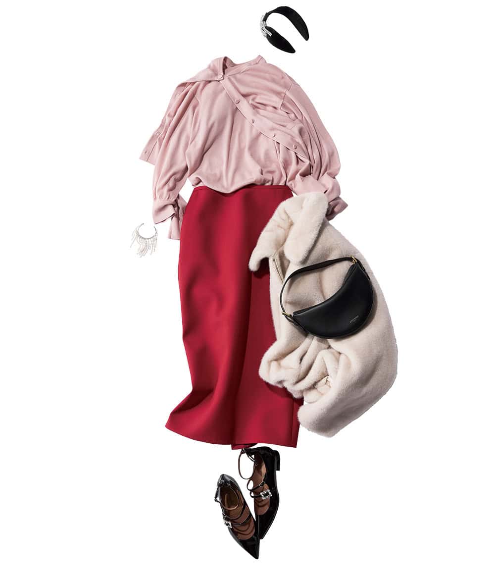 好感度ピンク × トレンドカラーがオススメ! 感度高めのカラーコーデも品よくロマンティック。パールやファーブルゾンで女性らしさを。