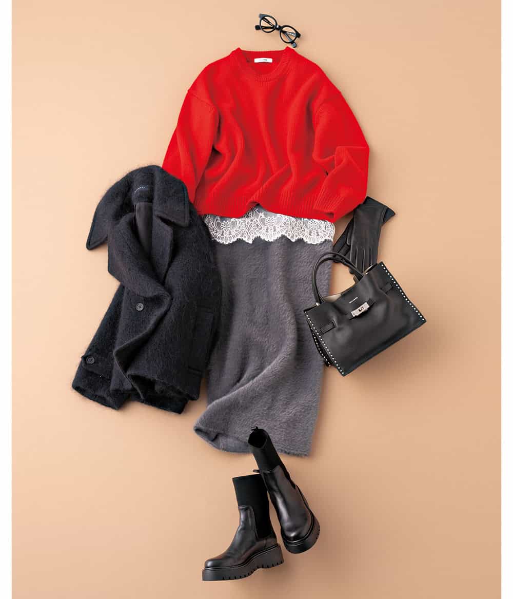スカート¥35,200ニット¥46,200(ともにスローン/ザ ショップ スローン新静岡セノバ店)レースカットソー¥19,800コート¥72,600(ともにマルティニーク/マルティニーク ルミネ横浜)バッグ¥46,200〈ヴィオラドーロ〉ブーツ¥34,100(ともにアルアバイル)メガネ¥71,500(アイヴァン 7285/アイヴァン 7285 トウキョウ)グローブ¥49,500(デンツ/真下商事)