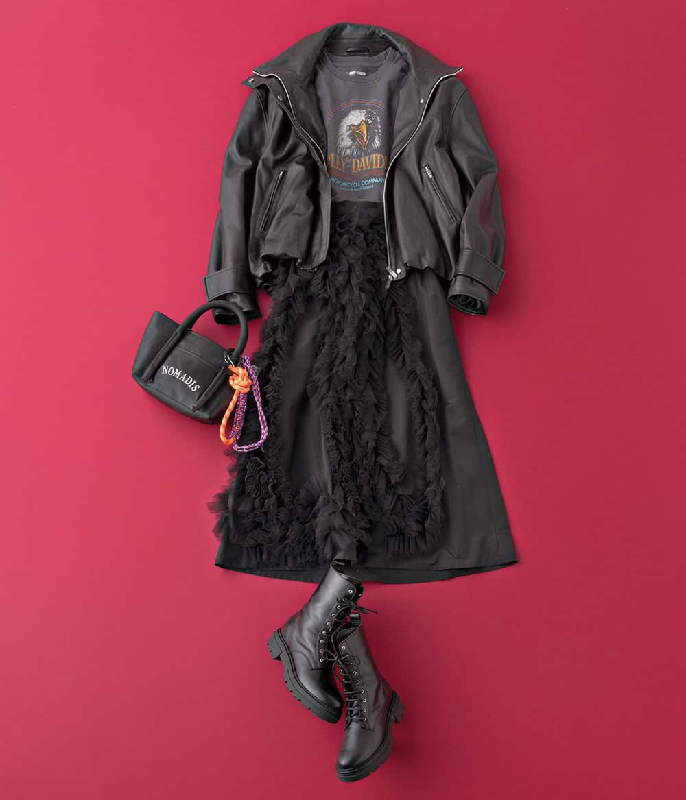 スカート¥36,000(シーニュ)ジャケット¥52,800(プランクプロジェクト/プランクプロジェクト 青山店)カットソー¥6,487(ハーレーダビッドソン/ハーレーダビッドソン ジャパン カスタマーサービス)バッグ¥22,000バッグチャーム¥11,000(ともにノマディス/ノーベルバ)ブーツ¥28,600(アルアバイル)