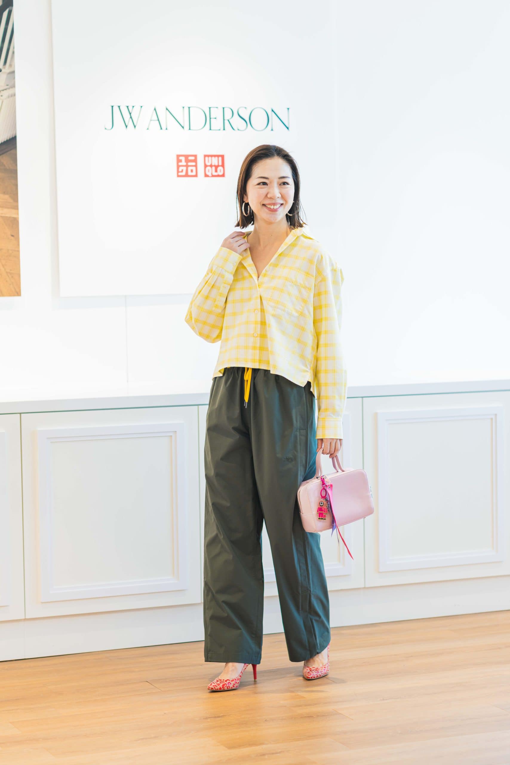 オックスフォードシャツ/チェック¥3,990 トラックパンツ¥4,990(ともにユニクロ アンド ジェイ ダブリュー アンダーソン/ユニクロ)※シャツはMサイズ、パンツはメンズLサイズを着用 靴、バッグ(ともに私物)