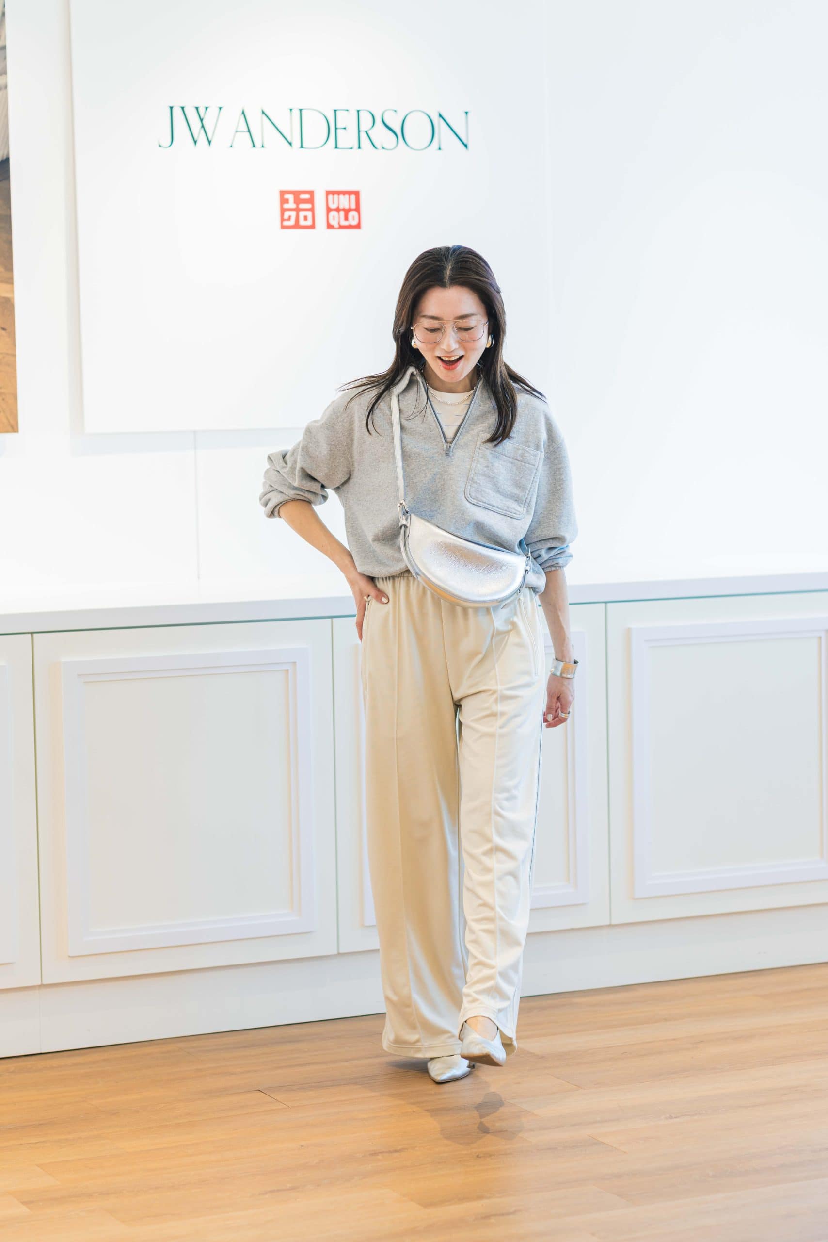 スウェットハーフジップスプルオーバー¥4.990 トラックパンツ¥4.990 ミニT¥1.990(すべてユニクロ アンド ジェイ ダブリュー アンダーソン/ユニクロ) ※トップス、パンツ、Tシャツ、全てMサイズを着用 バッグ、靴、サングラス(すべて私物)