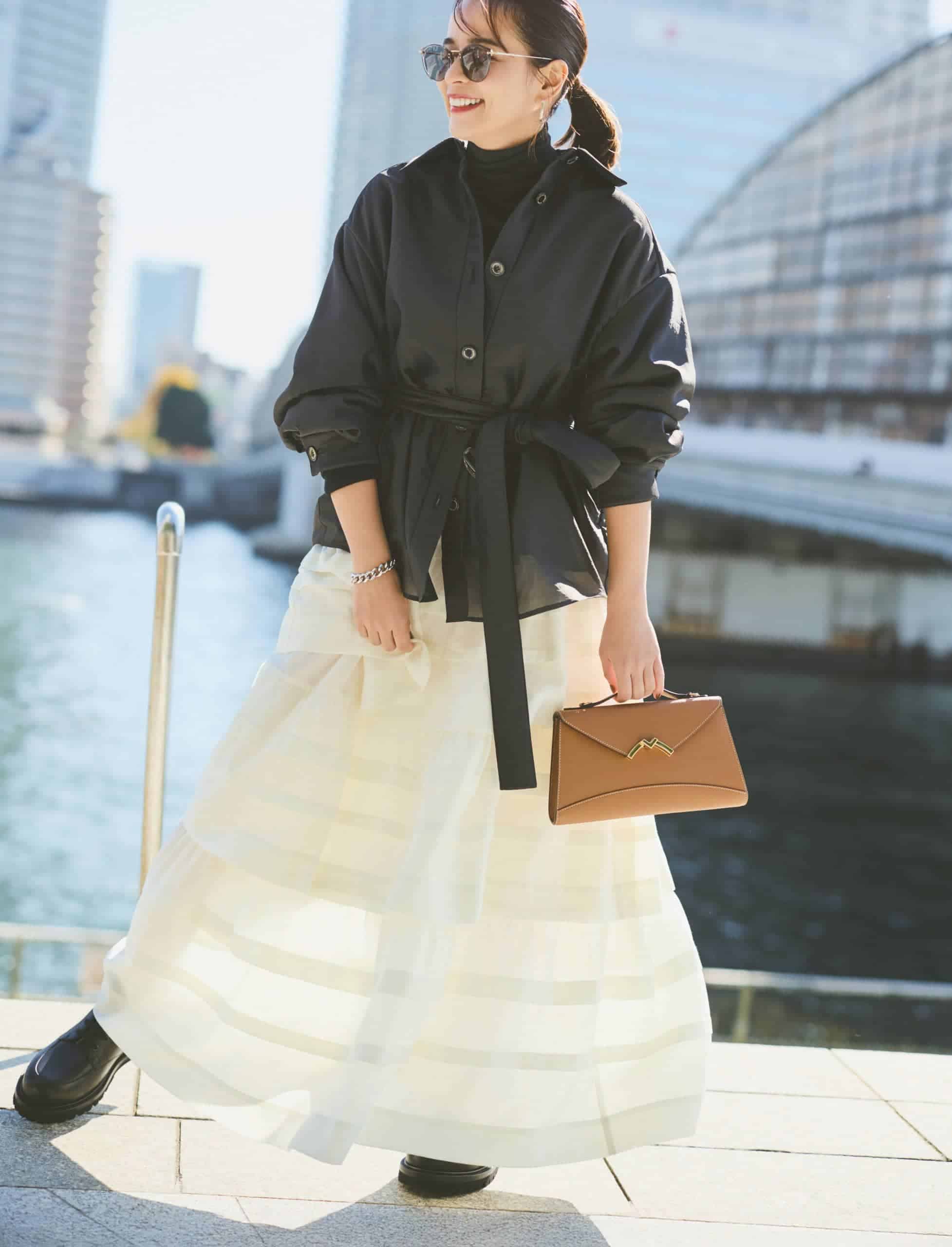 冬の定番だった黒アウターも、白スカートを合わせれば一気に春めくモノトーンに。構築的なデザインで、柄スカート感覚で着られます。ただのモノトーンに留まらず、華やぎとモード感を携えたスタイリングに。