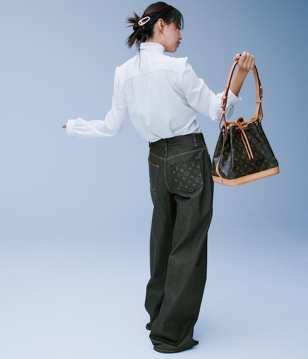 バッグ「プチ・ノエ」W27.0×H27.0×T21.0㎝¥308,000ブラウス¥426,800デニム¥311,300シューズ、ヘアピンともに参考商品(すべてルイ・ヴィトン/ルイ・ヴィトン クライアントサービス)
