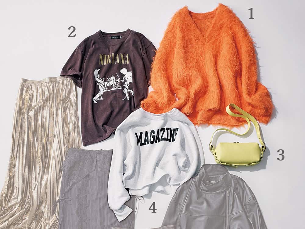 ①ニット¥17,930(メゾンスペシャル/メゾンスペシャル 青山店)②Tシャツ¥6,380(GOOD ROCK SPEED/グッドスピード)③バッグ¥39,600(トフ&ロードストーン)④スウェット¥25,300(サードマガジン)