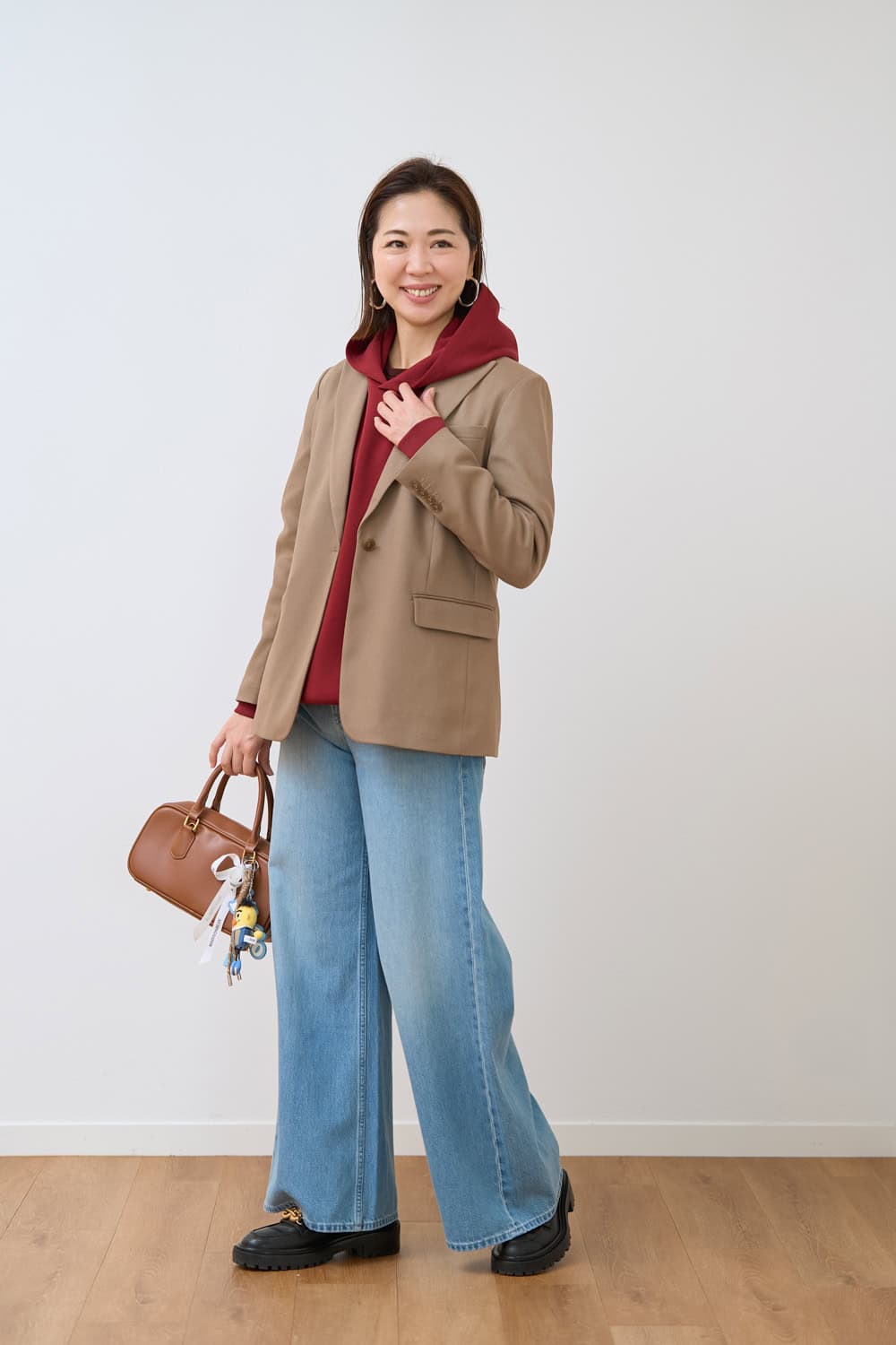 ベージュのジャケットに落ち着いたトーンの赤いパーカーを重ねることで、差し色が加わり季節感のある着こなしに。パーカーはハリ感のある素材で、カジュアルながら綺麗めな印象を演出してくれます。ボトムスには、ワイドのブルーデニムを合わせ、抜け感とリラックス感をプラスしました。きちんと感とカジュアルバランスが絶妙な、春のおでかけスタイルです。