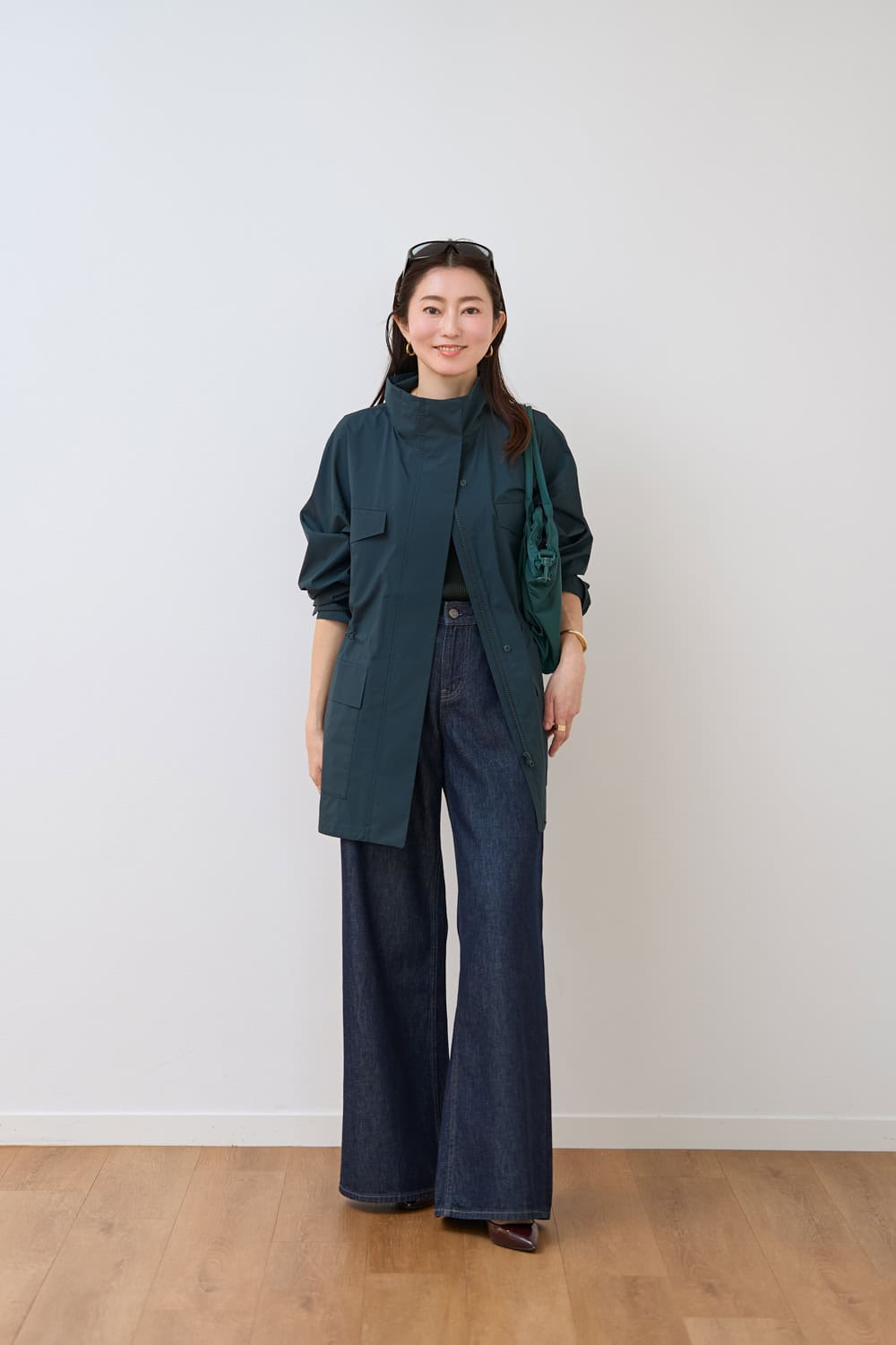 シンプルでありながら、上品さが際立つ大人のためのデニムスタイル。ウエストシェイプされた程よくスポーティーなアウターが体のラインを美しく見せ、ワイドジーンズの縦長シルエットがすっきりとした印象を演出します。ダークグリーンとデニムのインディゴの配色が洗練されたバランスで、カジュアルになりすぎずデイリーからきれいめカジュアルまで幅広く活躍してくれそう。