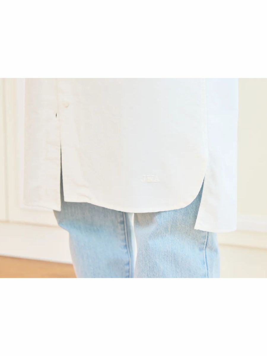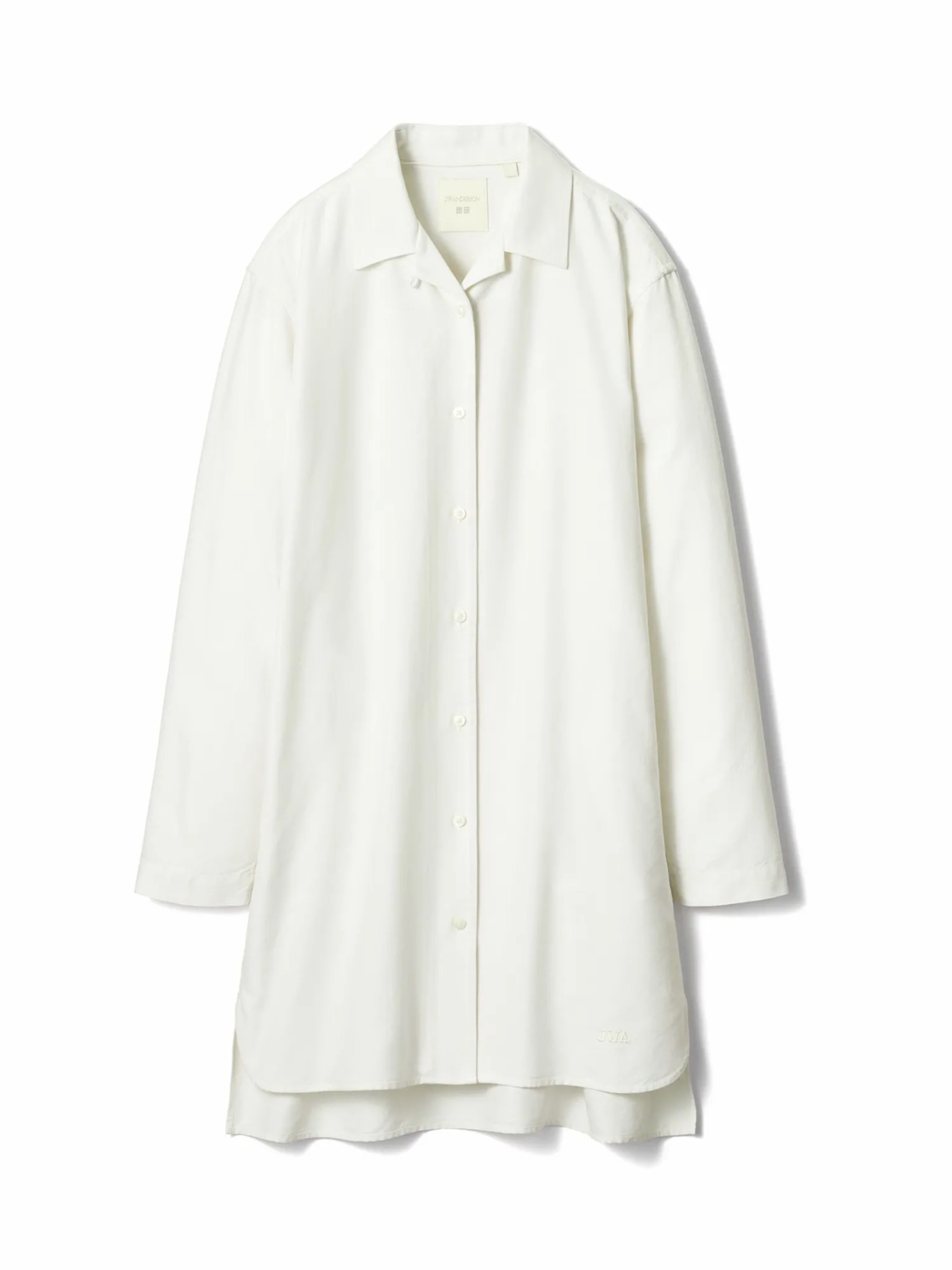 ハリのあるシャツ地ながらも、Aラインかつ肩が少し落ちていることでかしこまりすぎず、デイリーに着られる一着。膝がちょうど隠れるくらいの丈で、ミニワンピ以外に羽織りとしても活躍。ほんのり前後差のあるヘムラインは、サイドシルエットまで美しく見せてくれます。両サイドにはポケットがついていて、機能性も抜かりなし!