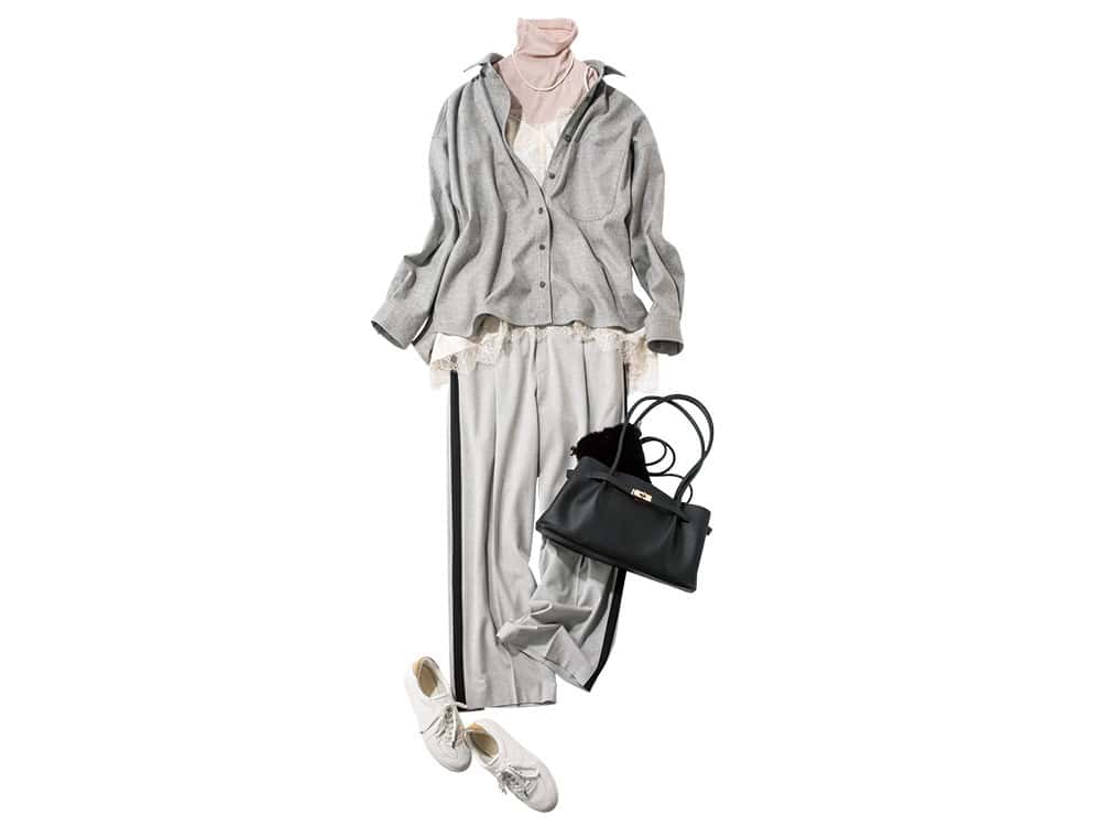 ウールライクシャツ¥7,700 ラメタートル¥4,400 レースサテンキャミソール¥6,600 ラインワイドパンツ¥8,250 スニーカー¥9,350 バッグ¥8,250 ファーバッグ¥4,620 パール付きシュシュ¥2,750 (すべてエルーラ/アダストリア)パールネックレス、ピアス(ともに参考商品)