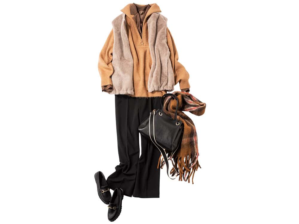 ブラウス¥8,800 ハーフジップニット¥7,700 エコムートンベスト¥14,300 ワイドパンツ¥7,700 タータンチェックマフラー¥6,050 3WAYトートバッグ¥7,150 ビットローファー¥8,800 (すべてエルーラ/アダストリア)メガネ、チョーカー、ネックレス(すべて参考商品)