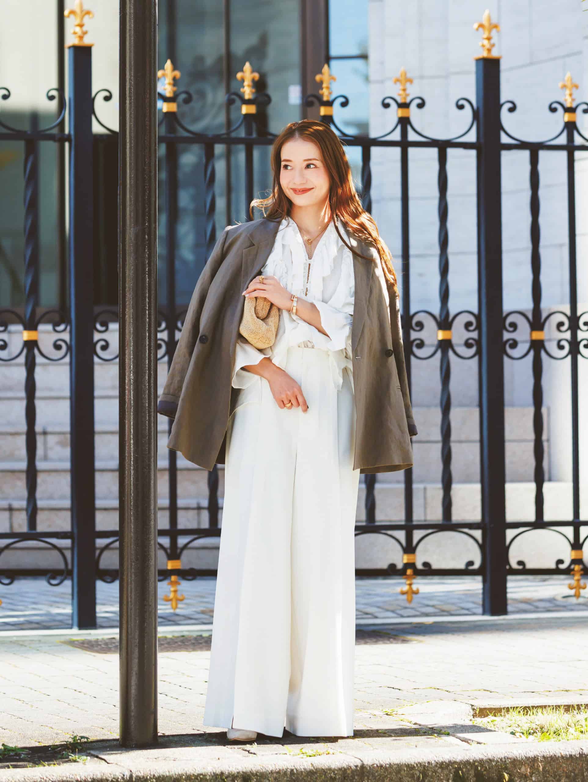 甘々なフリルブラウスは、落ち着いたブラウンジャケットで引き締めて。ホワイトワントーンに落ち着きを加え、キリっと端正な印象へ導きます。細身にもワイドにも合わせやすい絶妙なサイズ感で着回し力も優秀。