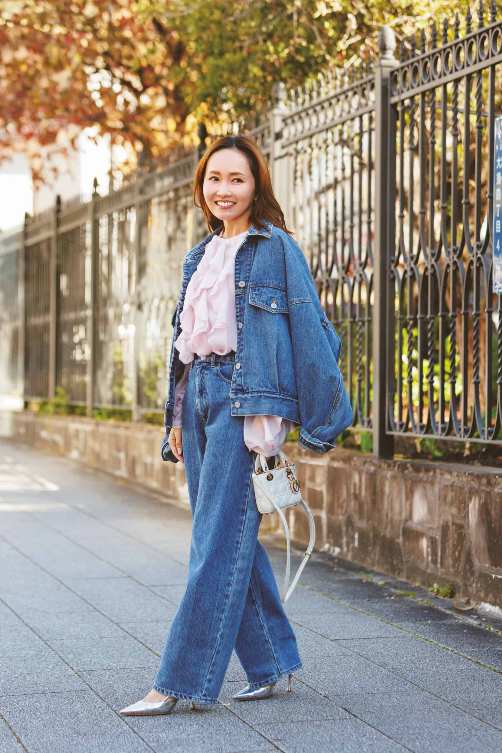 ふんわりフリルブラウスにブルーのデニムセットアップでパッと春らしく。肩の力を抜いたゆったりシルエットが今どきで、甘さとカジュアルのバランスも絶妙。これからの季節に頼れる軽快アウターです。